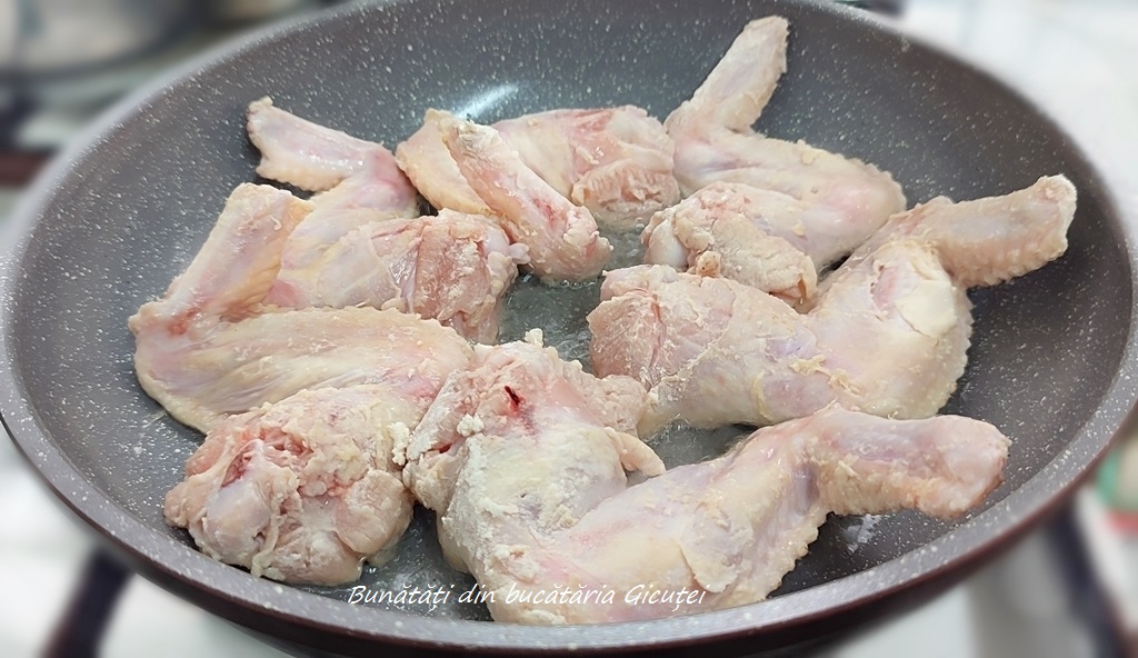 Prima dată ne vom ocupa de aripioare. Le pârlim, apoi le curățăm și le tăiem puțin din vârfuri. Le spălăm bine cu apă rece și le lăsăm la scurs. Când sunt scurse, le punem într-un castron, presărăm o lingură de făină peste ele și amestecăm bine, astfel încât făina să cuprindă toate aripioarele.