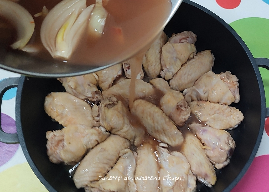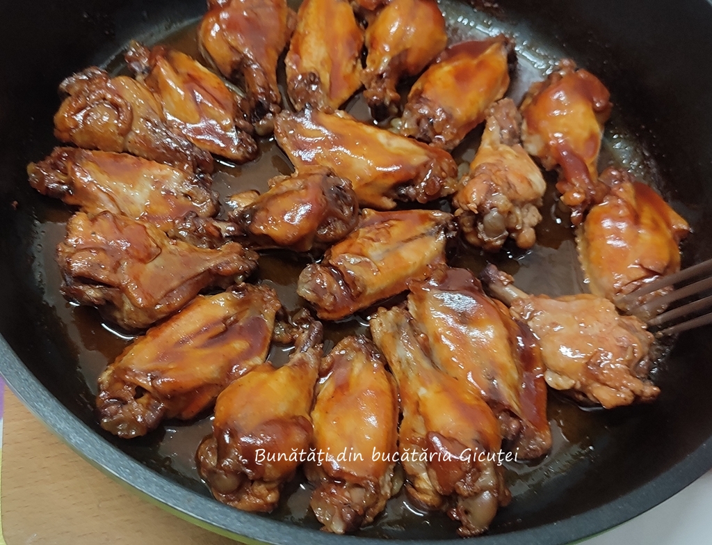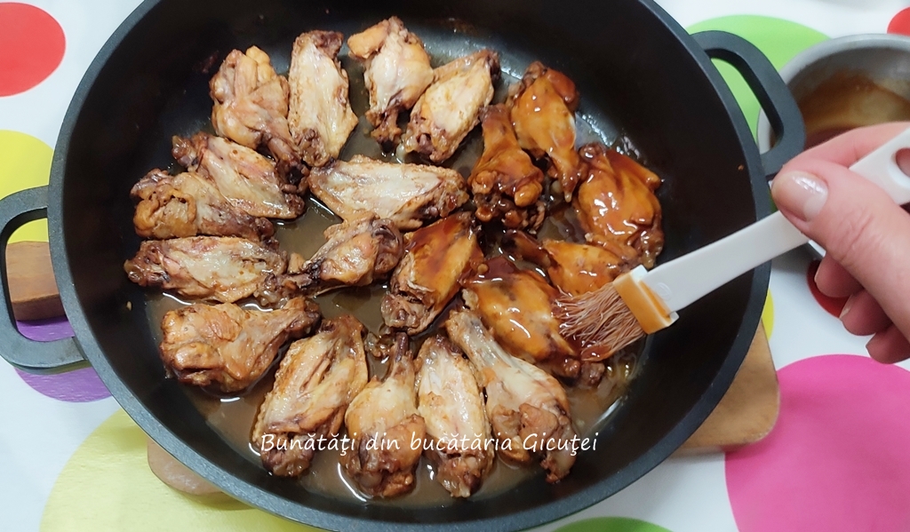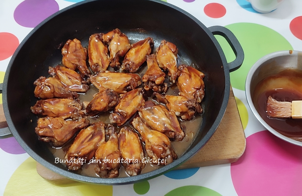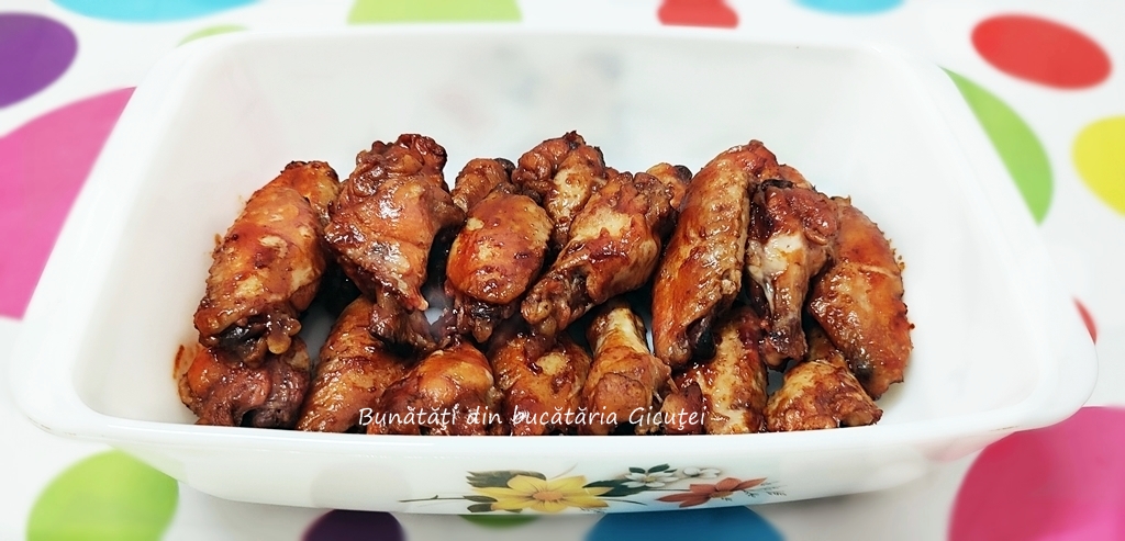Parlim aripioarele, le curatam si spalam, apoi indepartam varfurile si le taiem in doua. Eu nu am aruncat varfurile, le-am pus intr-o ciorba de cartofi si praz pentru a capata gust si mai bun. Punem aripioarele intr-un vas si turnam apa rece cat sa treaca peste ele cu 2-3 degete. Le lasam asa cam o jumatate de ora timp in care mai schimbam apa de 1, 2 ori…in felul acesta mai iese sangele din ele. Punem vinul intr-o cana mai mare sau orice alt vas si adaugam sare, boia si piper macinat. Eu am pus cam o lingurita cu sare si cate ½ lingurita de boia si piper macinat. Daca doriti puteti folosi si alte condimente care va plac. Amestecam pana se dizolva sarea. Indepartam primele frunze de la ceapa, o spalam si o taiem in solzisori mai mari. Punem aripioarele intr-o cratita/oala mai mica, peste aripioare punem ceapa taiata, apoi turnam vinul condimentat. Vinul trebuie sa ajunga macar la nivelul aripioarelor sau sa treaca peste cu un deget, doua. Acoperim cratita cu capac si lasam aripioarele sa stea la marinat cel putin doua ore sau mai bine peste noapte in frigider. Dupa acest timp asezam aripioarele, fara sa le suprapunem, intr-un vas incapator…eu am folosit o cratita larga, dar se poate folosi o tava sau un vas termorezistent. Turnam marinada in care au stat cu cepa cu tot. Punem vasul in cuptorul aprins la foc iute(200°C) unde vor sta in total cam o ora. Cand aripioarele incep sa fiarba indepartam spuma care se formeaza la suprafata. Dupa cca 20 de minute intoarcem aripioarele si pe partea cealalta. Intre timp pregatim sosul cu care le vom unge mai spre final: amestecam mierea cu ketchup, otet balsamic si sos de soia. Daca mierea pe care o folosim nu este fluida incalzim amestecul pe baie de aburi pana aceasta se dizolva. Dupa alte 15-20 de minute scoatem vasul din cuptor, indepartam ceapa si ungem/pensulam aripioarele cu jumatate din sos. Avem grija ca in tava sa fie zeama macar cat degetul mic ca sa nu se arda aripioarele. Daca zeama a scazut complet mai putem adauga putin vin sau apa pe care il vom turna pe marginea vasului, pe langa aripioare. Dam tava din nou la cuptor pentru cca 10 minute dupa care vom intoarce aripioarele si pe partea cealalta si le ungem/pensulam cu restul sosului. Dupa alte 10 minute aripioarele vor fi gata…..sunt foarte fragede, aromate si usor picante cu un invelis dulce-acrisor. Noi le-am servit doar cu un sos de iaurt si usturoi, dar merg foarte bine si diverse garnituri alaturi: de legume, orez, piure de cartofi sau….cartofi prajiti. Deliciu!