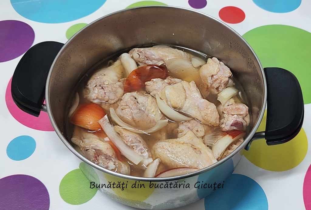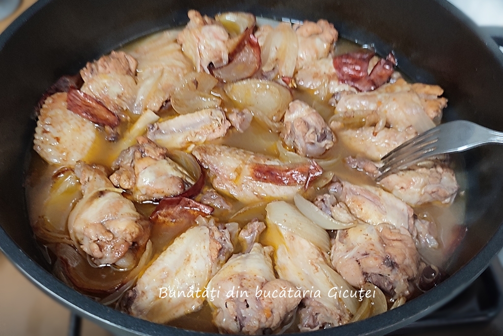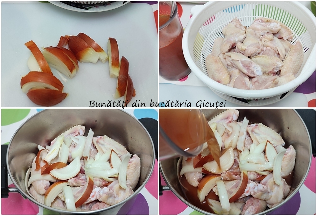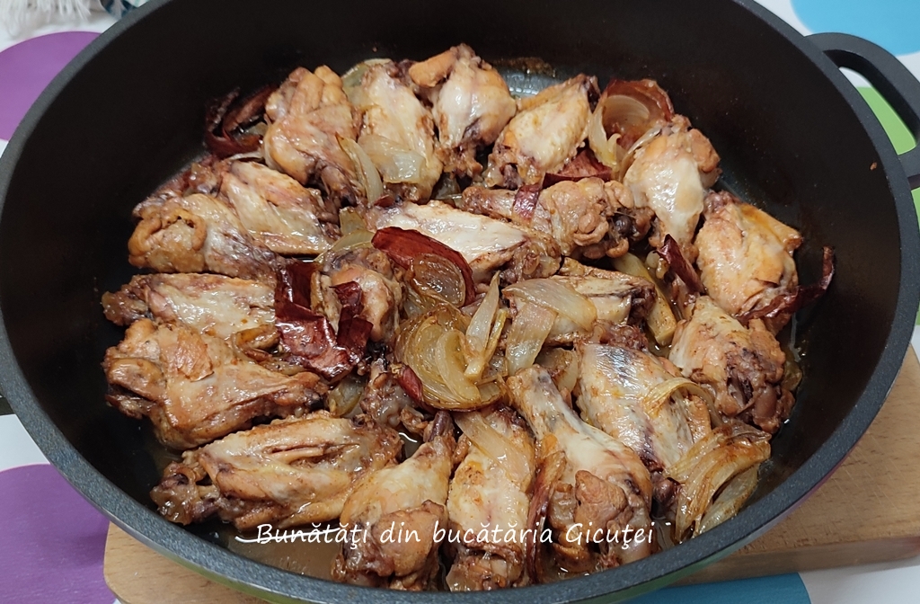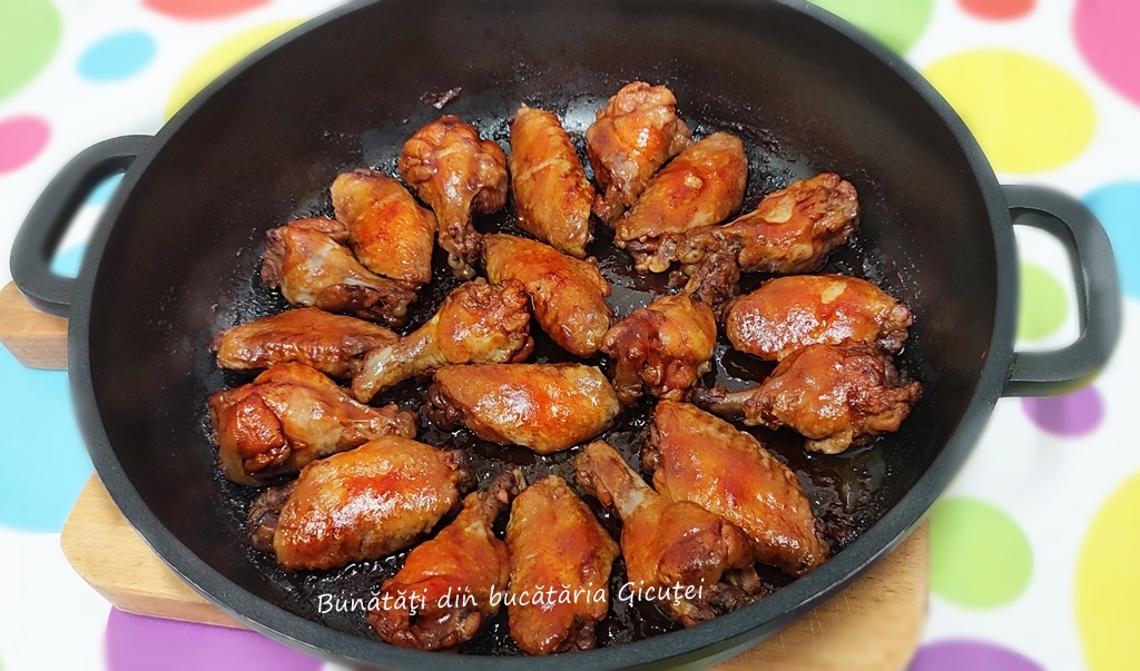 Parlim aripioarele, le curatam si spalam, apoi indepartam varfurile si le taiem in doua. Eu nu am aruncat varfurile, le-am pus intr-o ciorba de cartofi si praz pentru a capata gust si mai bun. Punem aripioarele intr-un vas si turnam apa rece cat sa treaca peste ele cu 2-3 degete. Le lasam asa cam o jumatate de ora timp in care mai schimbam apa de 1, 2 ori…in felul acesta mai iese sangele din ele. Punem vinul intr-o cana mai mare sau orice alt vas si adaugam sare, boia si piper macinat. Eu am pus cam o lingurita cu sare si cate ½ lingurita de boia si piper macinat. Daca doriti puteti folosi si alte condimente care va plac. Amestecam pana se dizolva sarea. Indepartam primele frunze de la ceapa, o spalam si o taiem in solzisori mai mari. Punem aripioarele intr-o cratita/oala mai mica, peste aripioare punem ceapa taiata, apoi turnam vinul condimentat. Vinul trebuie sa ajunga macar la nivelul aripioarelor sau sa treaca peste cu un deget, doua. Acoperim cratita cu capac si lasam aripioarele sa stea la marinat cel putin doua ore sau mai bine peste noapte in frigider. Dupa acest timp asezam aripioarele, fara sa le suprapunem, intr-un vas incapator…eu am folosit o cratita larga, dar se poate folosi o tava sau un vas termorezistent. Turnam marinada in care au stat cu cepa cu tot. Punem vasul in cuptorul aprins la foc iute(200°C) unde vor sta in total cam o ora. Cand aripioarele incep sa fiarba indepartam spuma care se formeaza la suprafata. Dupa cca 20 de minute intoarcem aripioarele si pe partea cealalta. Intre timp pregatim sosul cu care le vom unge mai spre final: amestecam mierea cu ketchup, otet balsamic si sos de soia. Daca mierea pe care o folosim nu este fluida incalzim amestecul pe baie de aburi pana aceasta se dizolva. Dupa alte 15-20 de minute scoatem vasul din cuptor, indepartam ceapa si ungem/pensulam aripioarele cu jumatate din sos. Avem grija ca in tava sa fie zeama macar cat degetul mic ca sa nu se arda aripioarele. Daca zeama a scazut complet mai putem adauga putin vin sau apa pe care il vom turna pe marginea vasului, pe langa aripioare. Dam tava din nou la cuptor pentru cca 10 minute dupa care vom intoarce aripioarele si pe partea cealalta si le ungem/pensulam cu restul sosului. Dupa alte 10 minute aripioarele vor fi gata…..sunt foarte fragede, aromate si usor picante cu un invelis dulce-acrisor. Noi le-am servit doar cu un sos de iaurt si usturoi, dar merg foarte bine si diverse garnituri alaturi: de legume, orez, piure de cartofi sau….cartofi prajiti. Deliciu!