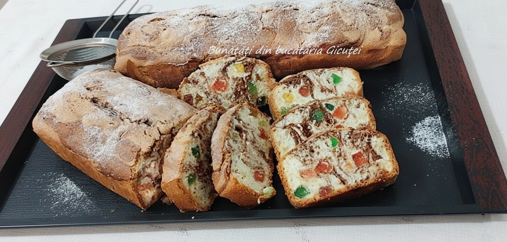 Pornim cuptorul la foc mediu(180°C), apoi asternem hartie de copt in doua tavi. Eu am folosit doua tavi de cozonac cu dimensiunile de 7x12x33 cm, dar mergeau si unele putin mai micute.