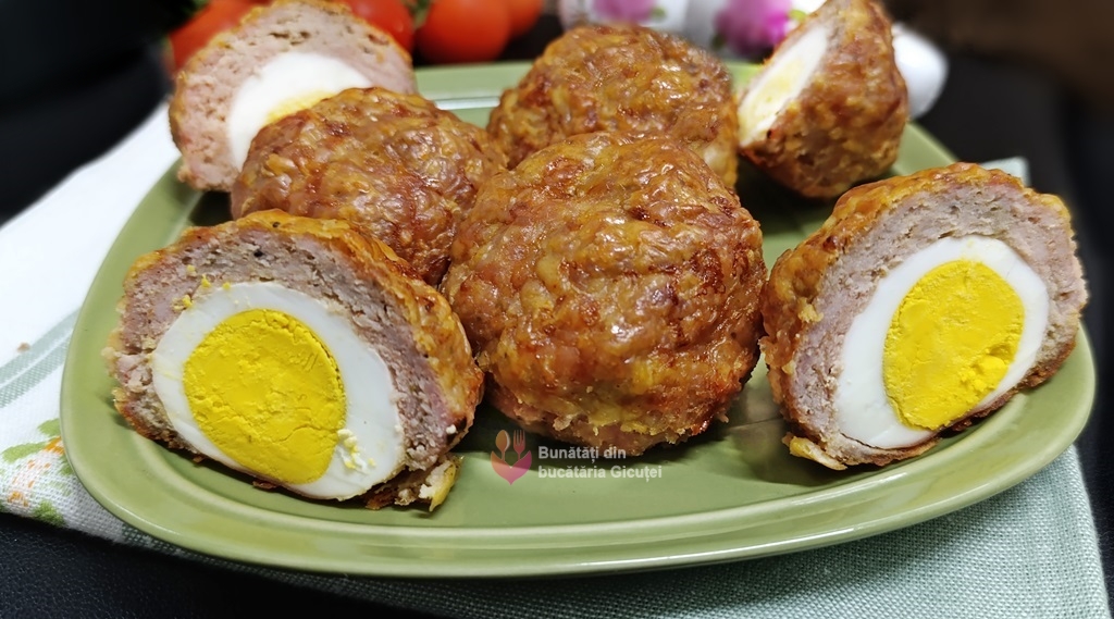 La aceasta reteta se poate folosi carne amestec porc/vita sau doar carne de porc sau carne de vita. Carnea trebuie sa aiba si grasime ca altfel chiftelele nu vor fi suculente…carnea mea a fost doar de porc, a avut cam 25 % grasime si au iesit niste chiftele suculente si delicioase. Daca doriti ca ouale sa iasa mai cleioase le fierbeti doar 3 minute maxim pentru ca se vor mai gati si in cuptor. Eu le-am fiert aproximativ 4 minute, dar data viitoare le las mai putin.