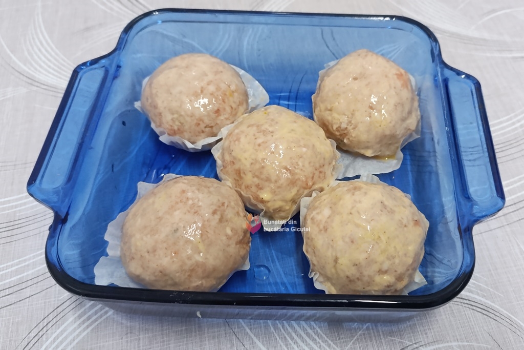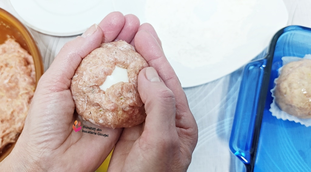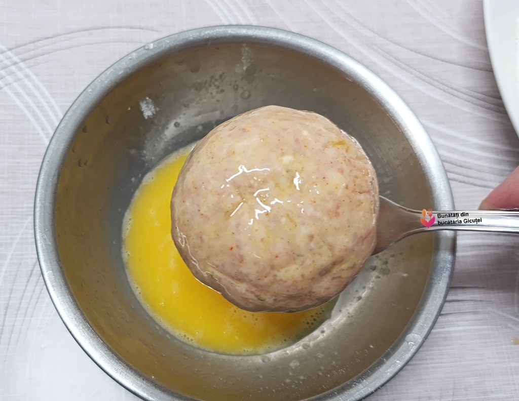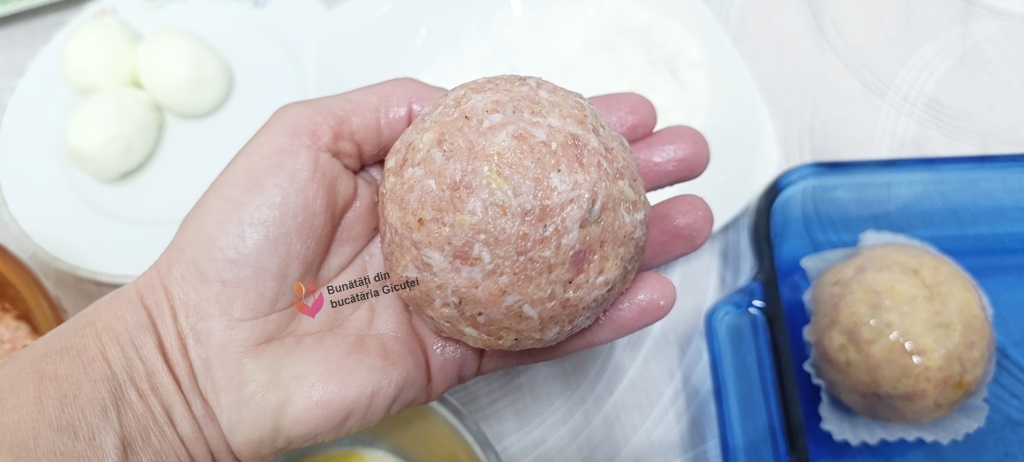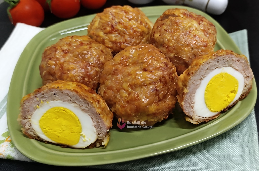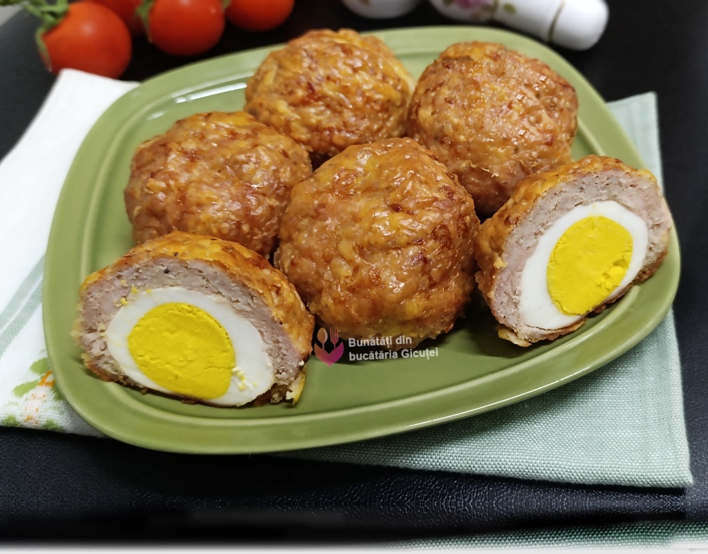 La aceasta reteta se poate folosi carne amestec porc/vita sau doar carne de porc sau carne de vita. Carnea trebuie sa aiba si grasime ca altfel chiftelele nu vor fi suculente…carnea mea a fost doar de porc, a avut cam 25 % grasime si au iesit niste chiftele suculente si delicioase. Daca doriti ca ouale sa iasa mai cleioase le fierbeti doar 3 minute maxim pentru ca se vor mai gati si in cuptor. Eu le-am fiert aproximativ 4 minute, dar data viitoare le las mai putin.