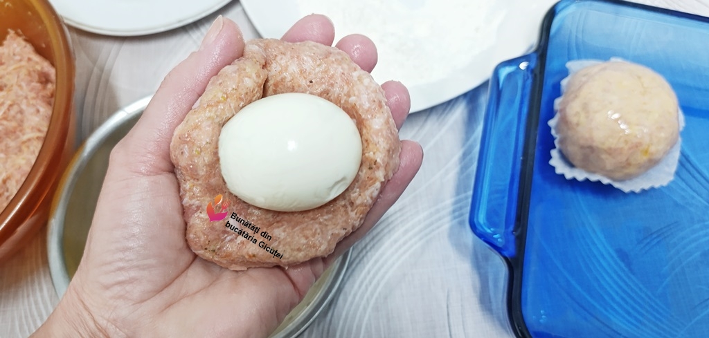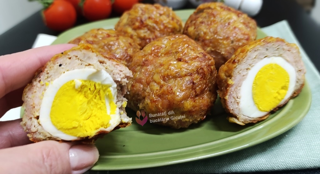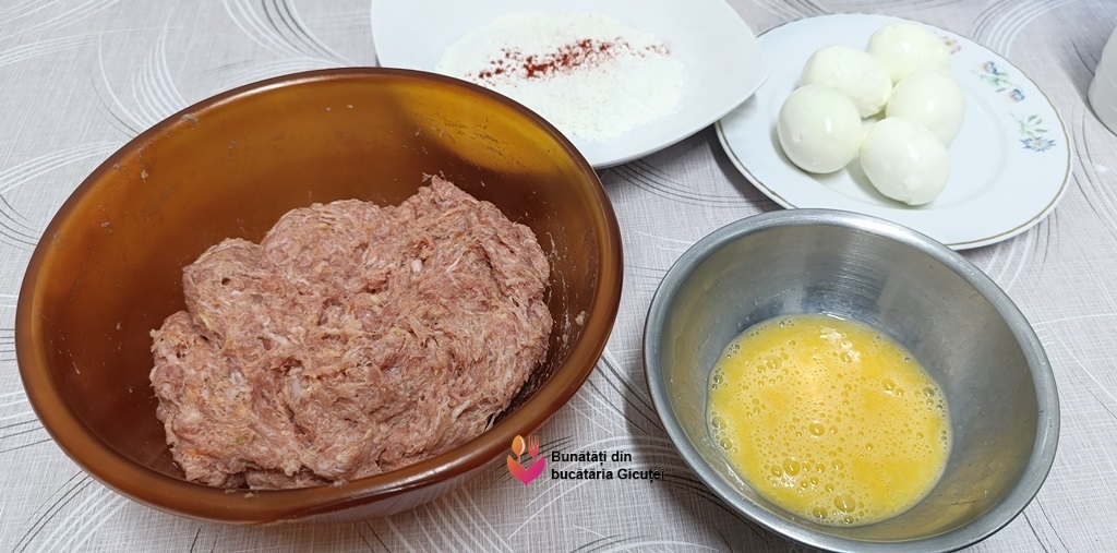 Cum procedam: punem carnea tocata intr-un bol , iar peste ea adaugam usturoiul ras pe razatoarea fina sau trecut prin presa speciala. Condimentam dupa gust cu sare, piper macinat, cimbru si boia de ardei. Amestecam/framanatam totul foarte bine. Curatam ouale de coaja, apoi punem intr-o farfurie 3-4 linguri cu faina, un praf de sare si putina boia. Amestecam totul foarte bine. Intr-un castronel spargem oul crud, adaugam o lingura cu lapte si putina sare, apoi il batem bine cu furculita. Impartim carnea tocata, ochiometric, in cinci parti cat mai egale sau o putem cantari. Cu mainile umezite in apa luam prima parte din amestecul de carne tocata si o aplatizam pe podul palmei. Punem in mijlocul ei un ou fiert, strangem palma usor, apoi il acoperim cu ambele palme in strat uniform si ii dam forma rotunda. Vom obtine o chiftea mare, pe care o rostogolim prin amestecul de faina, apoi prin oul batut. Scoatem chifteaua din oul batut, o scurgem putin si o asezam intr-o tava, pe hartiute speciale de briose sau punem in tava hartie de copt. Procedam la fel cu restul de pasta de carne si oua. Punem tava in cuptorul preincalzit la foc mediu (180°C) pentru aproximativ 40 de minute sau pana chiftelele noastre umplute cu oua se rumenesc frumos. Cand sunt gata, le lasam 10 minute sa se racoreasca , apoi le putem servi. Sunt delicioase si calde, dar si reci.