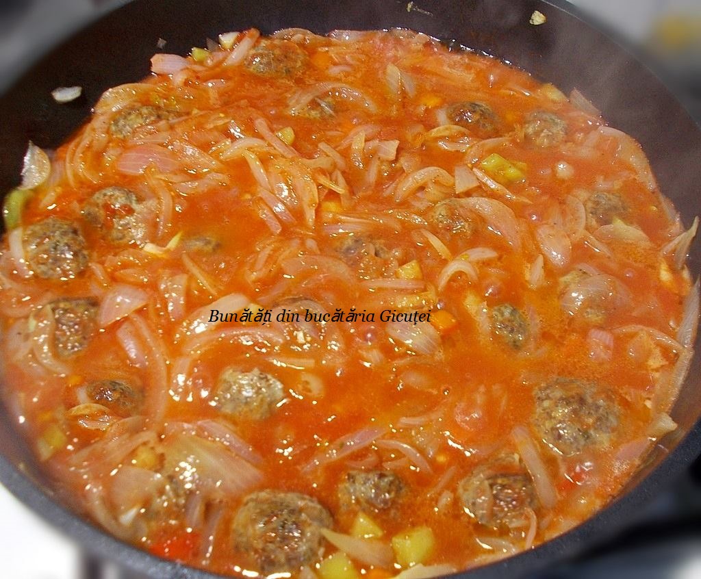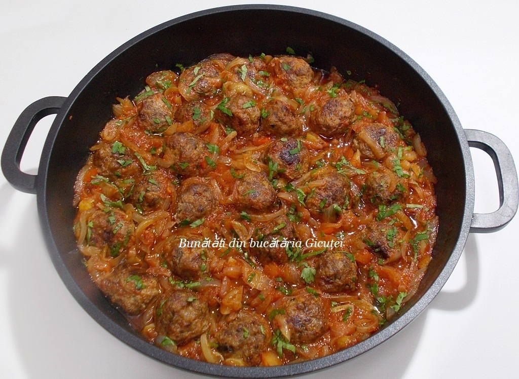Adaugam chiftelutele copate si o cescuta cu apa. Acoperim cratita partial cu un capac si lasam sa fiaraba cu totul cam 15-20 de minute sau pana sosul scade si se ingroasa putin. Spre sfarsit condimentam cu sare si piper. Patrunjeleul tocat il presaram deasupra mancarii cand luam cratita de pe foc. Bunatate!