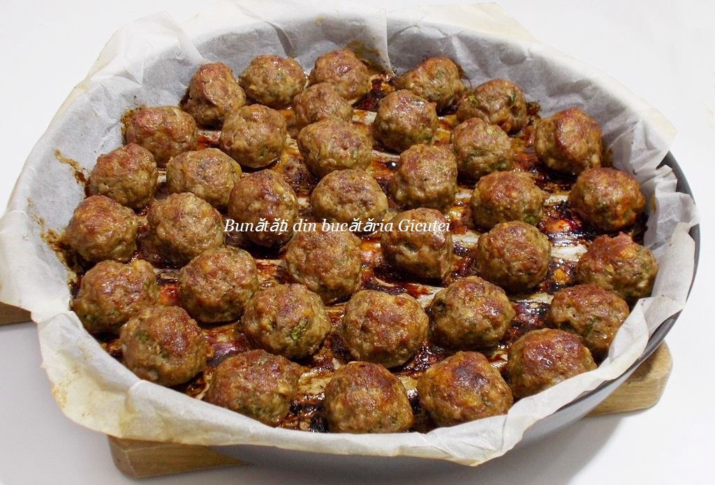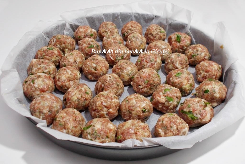 Curatam ceapa si usturoiul, apoi dam ceapa pe razatoarea mica, iar usturoiul il trecem prin presa speciala sau il zdrobim. Le punem peste carne impreuna cu restul ingredientelor. Amestecam totul foarte bine. Asternem hartie de copt intr-o tava. Cu mainile umezite in apa luam din compozitia de carne si formam chiftele rotunde, potrivit de mari. Mie mi-au iesit 36 de chiftelute, dar am oprit 10 bucati copate pe care le-am consumat ca atare ?. Dam tava la cuptor ( foc mediu 180 °C) pentru aproximativ 35-40 de minute. Dupa primele 20-25 de minute intoarcem chiftelele pe partea cealalta.