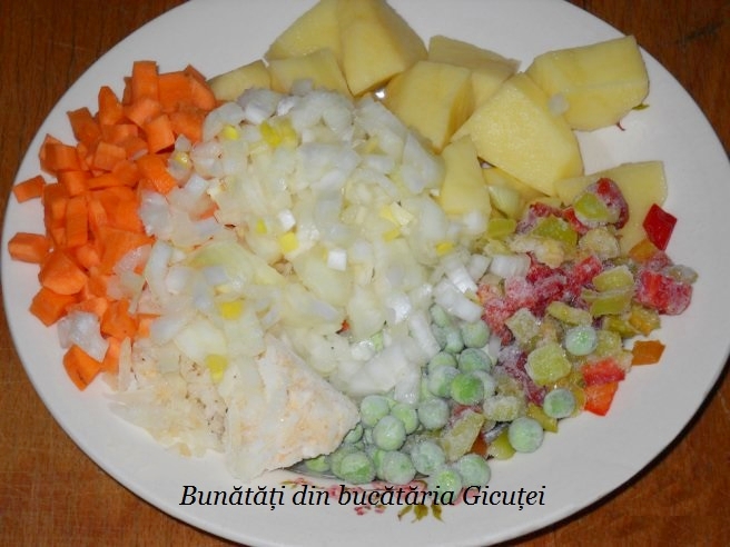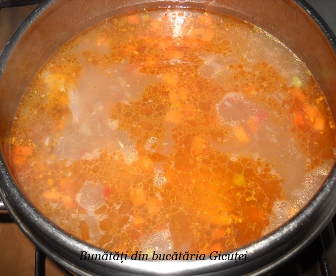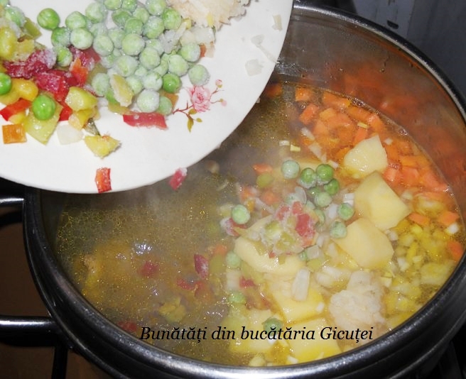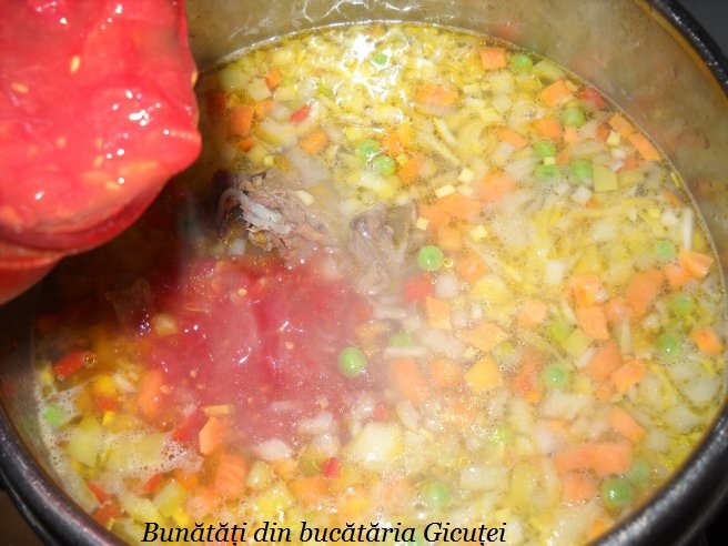 Cand s-a patruns carnea pe jumatate punem si legumele taiate si pe cele congelate(daca folositi). Cartofii ii adaugam fara apa in care au stat. Dupa preferinta se pot adauga si alte legum: pastarnac, radacina de patrunjel. De asemenea mazarea nu este un ingredient obigatoriu. Daca aveti zarzavat pentru ciorbe il puteti folosi. Daca zeama din oala scade prea mult mai putem completa cu apa fierbinte, insa este bine sa punem suficienta apa de la inceput.