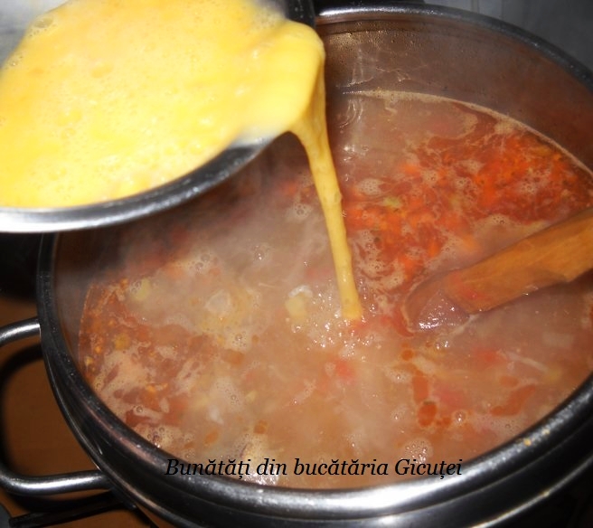 Lasam in continuare sa fiarba la foc mic, iar cand legumele incep sa se inmoaie punem rosiile cubulete. Eu am folosit rosii cubulete in suc propriu preparate de mine. Potrivim gustul de sare, apoi punem borsul intr-un ibric sau alt vas si il lasam sa fiarba pana da in cateva clocote. Il turnam in oala cu ciorba, apoi mai lasam cu totul sa fiarba pana legumele si carnea sunt bine patrunse. Spargem doua oua intr-un castronel, le batem/amestecam foarte putin cu furculita si le turnam in fir subtire in oala cu ciorba. In timp ce le turnam amestecam continuu cu furculita ca sa se formeze zdrente de ou. Inchidem focul de sub oala si adaugam verdeata tocata marunt. Ce bine miroase in bucatarie! Lasam ciorba sa se racoreasca 15 minute, apoi o servim cu paine proaspata si ardei iuti. Un deliciu!
