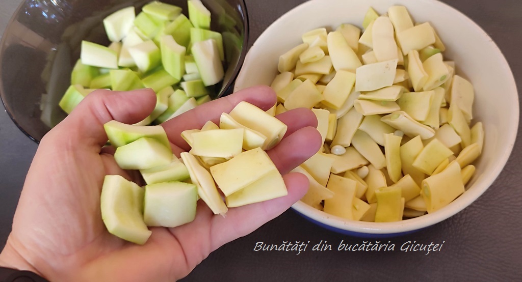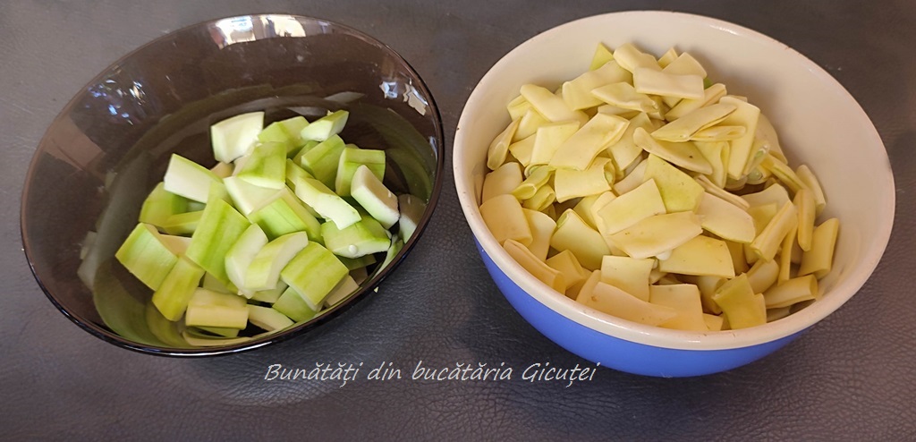 Spalam pastaile de fasole, le rupem capetele si le taiem in bucati potrivite ca marime cat sa incapa in lingura. Spalam dovlecelul, il curatam de coaja si seminte si il taiem in cuburi potrivit de mari sau cam de marimea bucatilor de fasole. Curatam ceapa, morcovul, ardeiul(daca nu folositi congelat), telina, albitura, apoi le spalam si le taiem cat de marunt dorim. Daca va este mai usor si va place puteti da pe razatoarea mare radacinoasele, eu alta data asa am procedat.