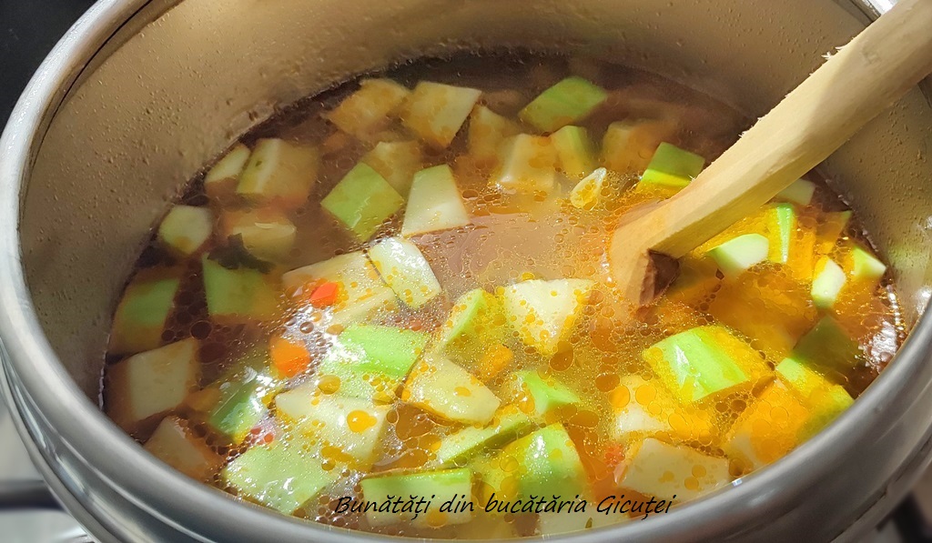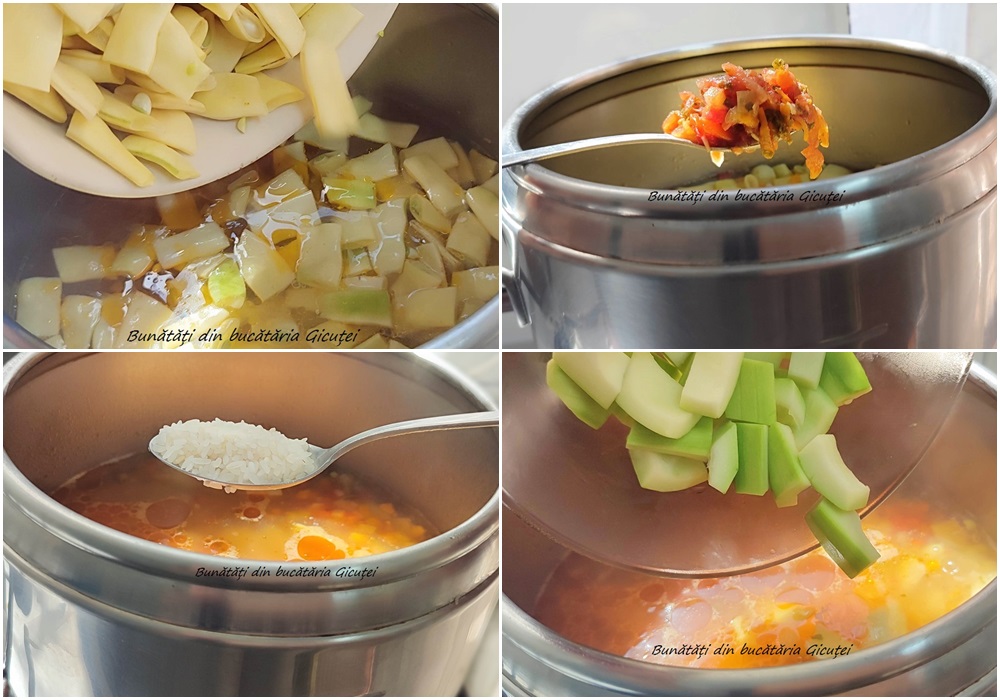 Cand sunt putin patrunse adaugam fasolea galbena. Dupa cca 10 minute punem zarzavatul pentru ciorbe si orezul. Zarzavatul pentru ciorbe se poate inlocui cu o cana cu suc de rosii sau 2-3 rosii bine copate, decojite si taiate cubulete sau date pe razatoarea mare. Cand orezul se inmoaie putin adaugam si bucatile de dovlecel si lasam sa fiarba pana orezul si toate legumele sunt bine patrunse. Daca apa scade prea mult mai putem completa cu apa fierbinte.