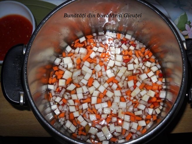 Curatam legumele, le spalam si le taiem cubulete. Le punem intr-o oala la fiert cu aproximativ 3 litri de apa. Le lasam sa fiarba pana se patrund putin.