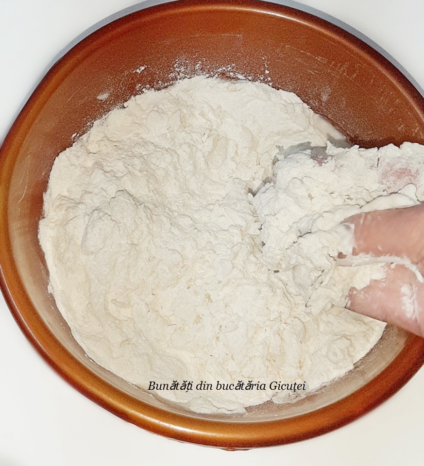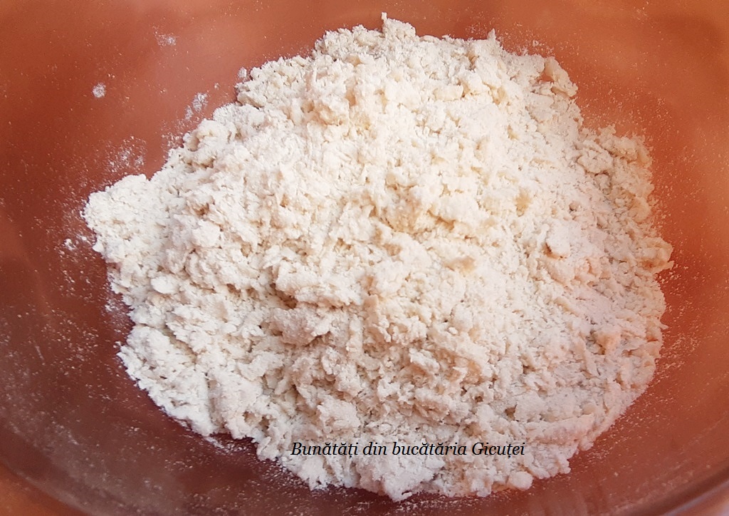 Cernem intr-un bol faina si picuram deasupra ei apa sau lapte rece. Pentru inceput vom pune doar 3-4 linguri si daca este nevoie mai adaugam. Incepem sa amestecam si sa frecam aluatul cu degetele/palmele pana obtinem niste firimituri mai mari. Daca nu se formeaza firimiturile, mai picuram apa/lapte.