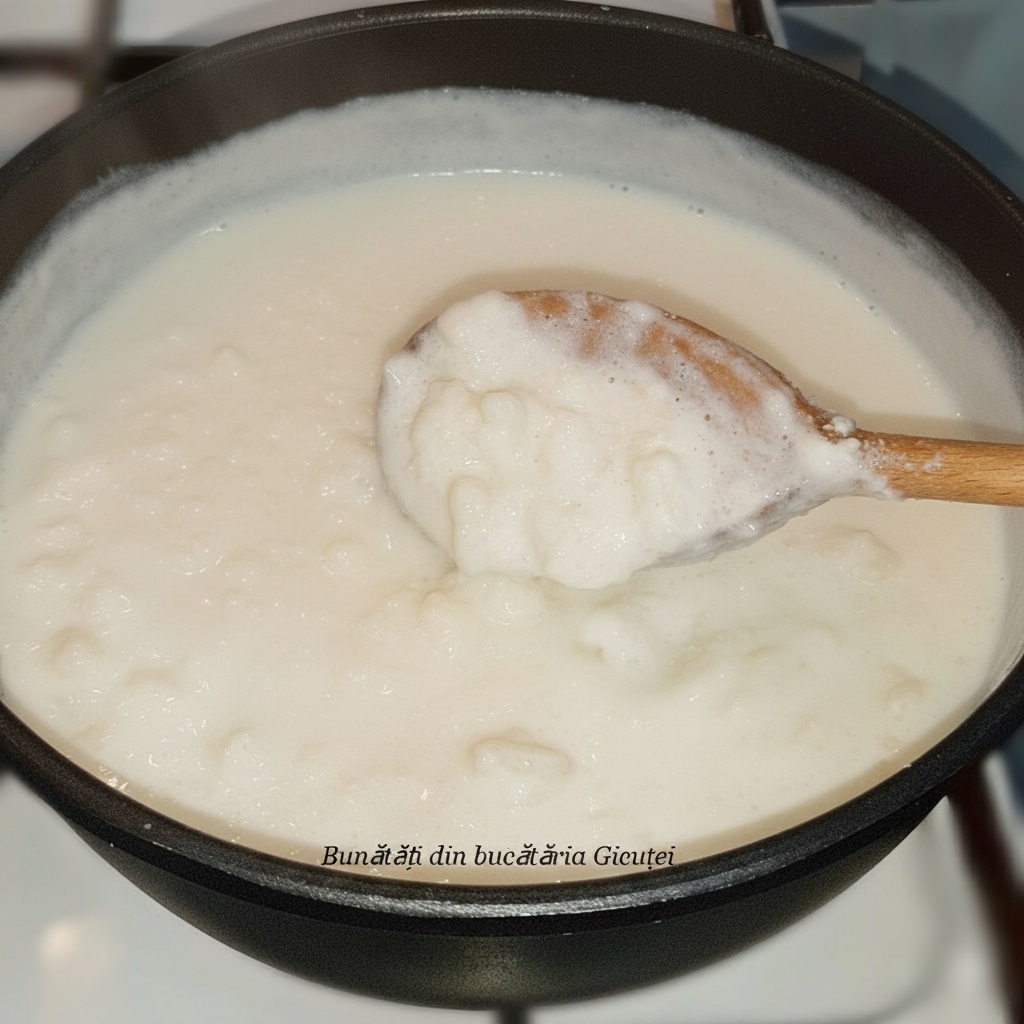 Punem laptele la fiert intr-o cratita/oala cu peretii mai grosi. Cand se infierbanta adaugam zaharul, zaharul vanilat si sarea, apoi amestecam si il lasam in continuare la fiert pe foc potrivit