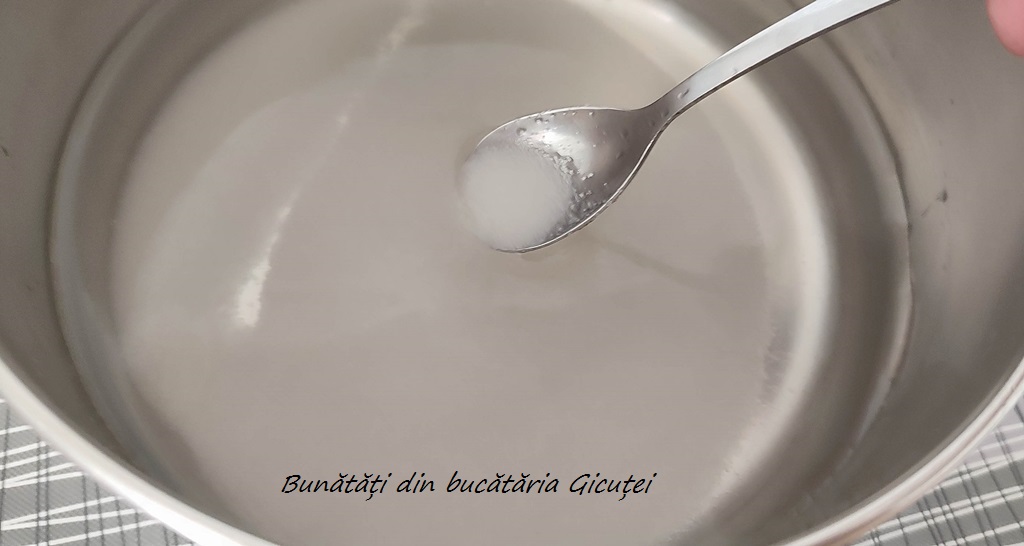 Cat timp stau la scurs pregatim siropul: punem zaharul intr-o craticioara, turnam apa si asezam cratita pe foc. Amestecam pana se dizolva zaharul, mai lasam sa dea cateva clocote, apoi dam craticioara deoparte si lasam siropul sa se raceasca complet.