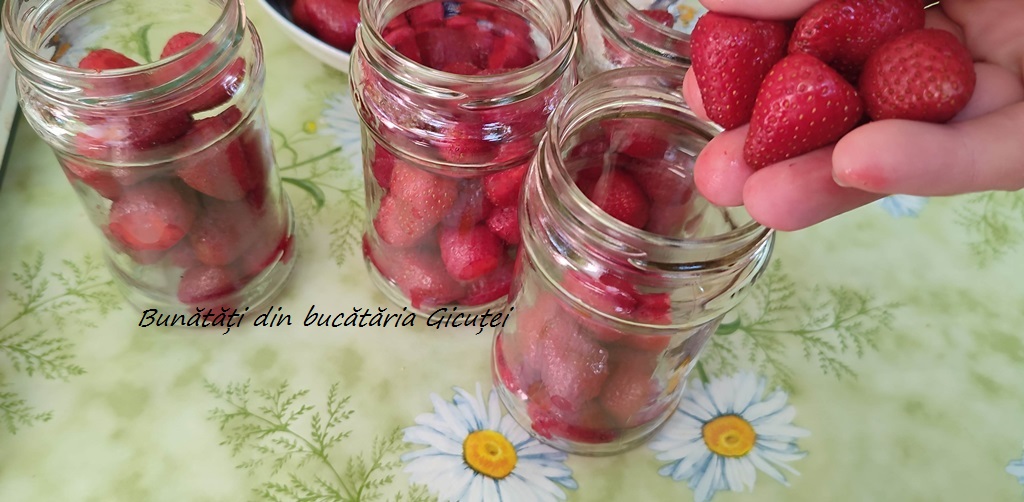 Indepartam coditele capsunilor scurse si le repartizam in borcanele sterilizate. Eu am umplut fiecare borcan cam pe trei sferturi, dar daca doriti puteti pune mai multe fructe. Dupa parerea mea sunt suficiente, vrem sa ne delectam si cu siropul aromat, pai nu-i asa?