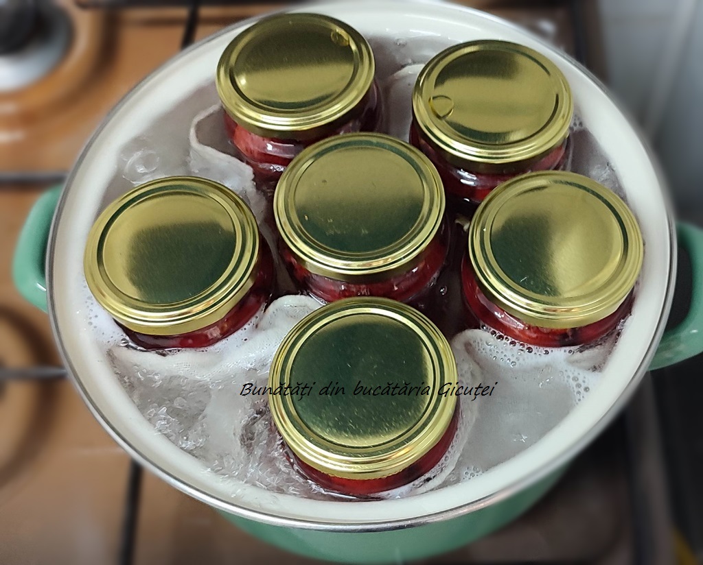 Adaugam zeama de lamaie in siropul racit, apoi amestecam. Umplem fiecare borcan cu sirop, inchidem borcanele cu capace, apoi le asezam intr-o oala in care asternem o laveta, un prosopel sau o bucata de panza. Tunam apa pana la umarul borcanelor si punem oala pe foc potrivit. Cand apa incepe sa fiarba cronometram 10 minute, dupa care oprim focul. Acoperim oala cu un capac sau un prosop gros si lasam bocanele cu compot sa se raceasca in oala in care au fiert. Cand se racesc le depozitam pe raftul din camara. Daca folositi borcane mai mari, spre exemplu borcane de 720 ml, timpul de fierbere va fi de 15-17 minute. Noi deja am “gustat” un borcanel de compot: este aromat, dulce atat cat trebuie si are o culoare superba. Recomand cu drag sa faceti si voi cateva borcanele…asa, de pofta.