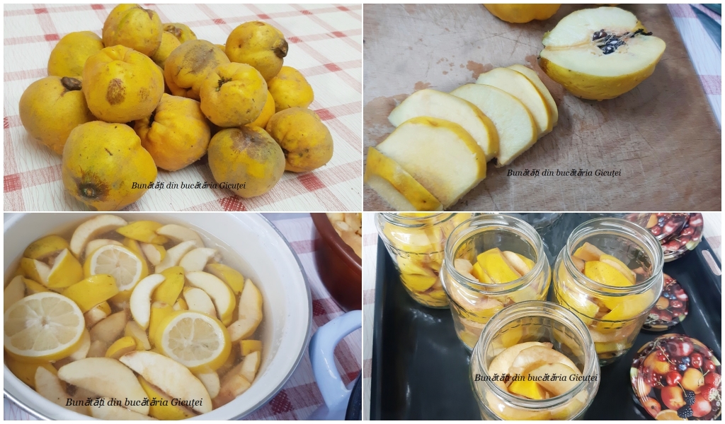 Spălăm bine gutuile cu un burete curat pentru a îndepărta puful, apoi le lăsăm la scurs. Când se scurg, luăm câte o gutuie, o tăiem în jumătate, apoi feliem fiecare bucată și îndepărtăm cotorul și semințele. Dacă doriți, le puteți tăia în cuburi mai mari. Pe măsură ce le tăiem, punem feliile de gutui într-un vas cu apă rece în care adăugăm o lămâie feliată (stoarcem zeama în apă); prin acest procedeu fructele oxidează mai puțin.