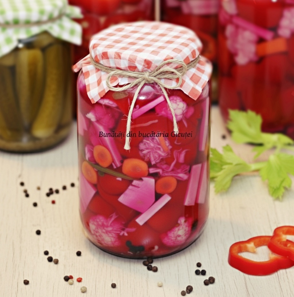 Am pus la borcan cea mai faină conopidă cu sfeclă roșie. Sfecla îi dă o culoare superbă și o aromă specială, iar hreanul o ține crocantă până în primăvară! Am turnat saramură fierbinte, am pus capacele și acum așteptăm cuminți. Vă recomand să faceți și voi măcar câteva borcane! Nu veți regreta! 😉