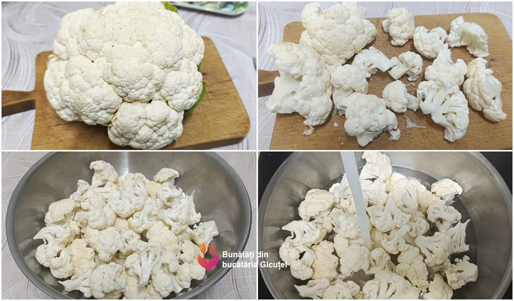 Mai întâi, desfacem conopida în buchețele și o spălăm cu atenție, deoarece uneori se pot ascunde insecte printre ea. Pentru a ne asigura că este perfect curată, vă sfătuiesc să o puneți într-un vas mare, să turnați apă rece cât să o acopere, apoi să adăugați 1-2 linguri cu oțet.O lăsăm așa cam jumătate de oră. După acest timp, o clătim sub jet de apă rece, o punem în strecurătoare și o lăsăm la scurs.