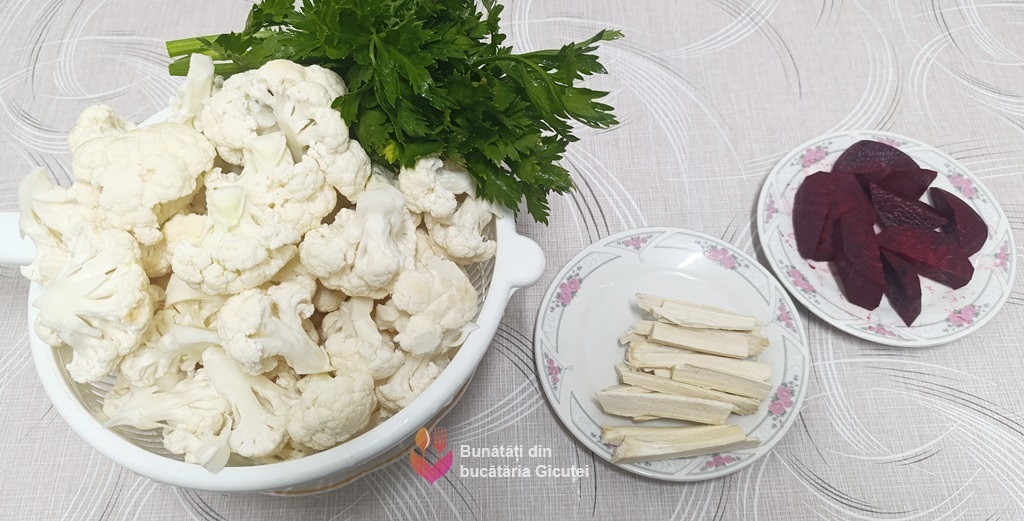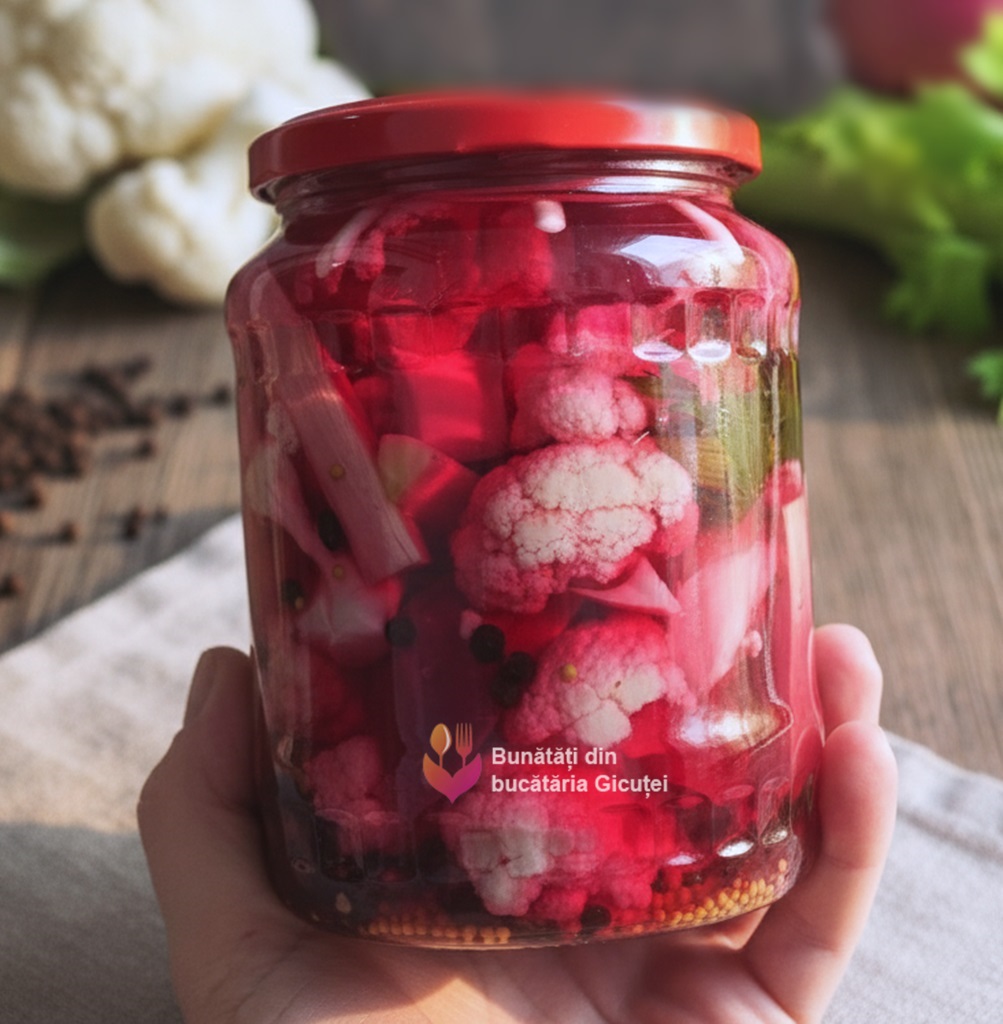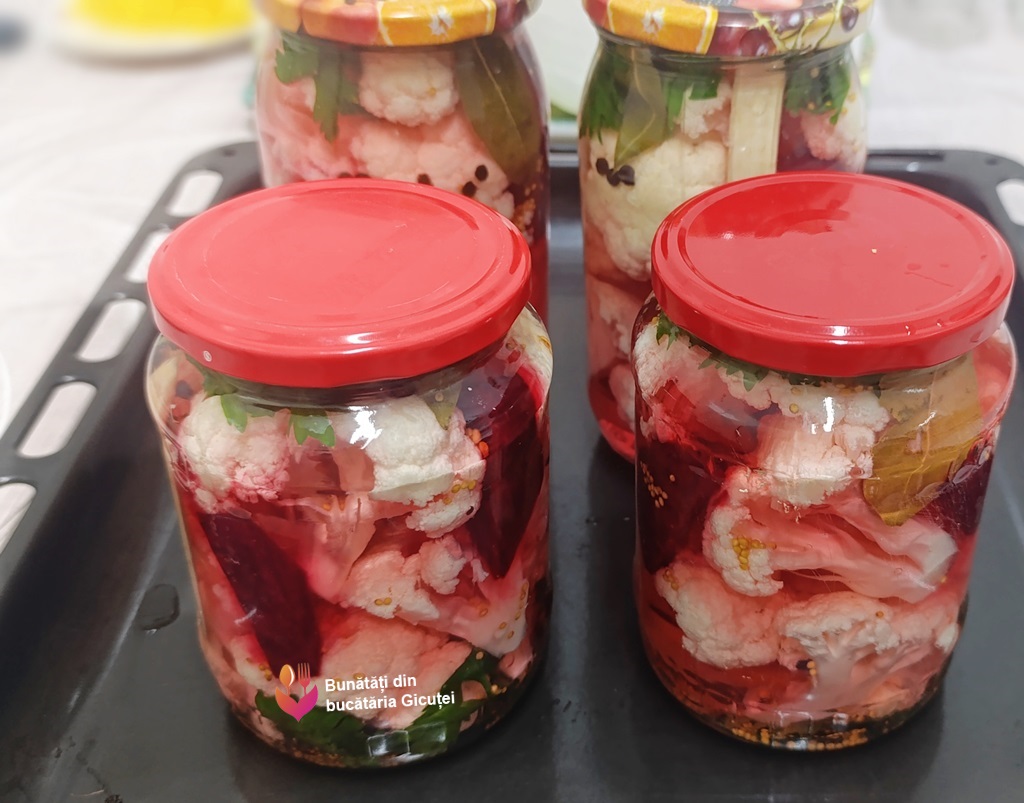 - Sfecla roșie din rețetă va accelera puțin procesul de murare și va da o culoare frumoasă conopidei.