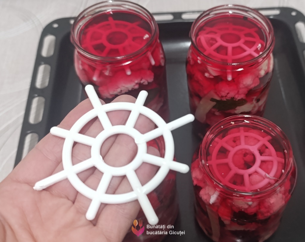 A doua zi, completăm cu conopida care ne-a rămas, deoarece legumele s-au mai tasat. Ca să ne asigurăm că legumele stau scufundate în saramură, putem să punem presatoare speciale sau stinghiuțe. Acum nu ne mai rămâne decât să așezăm borcanele în cămară.