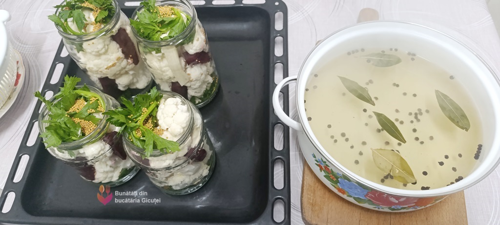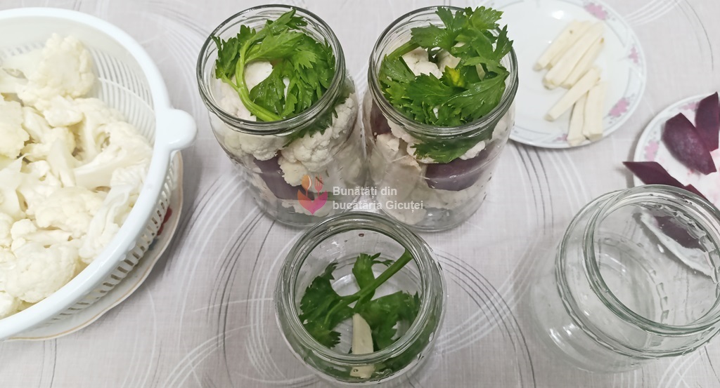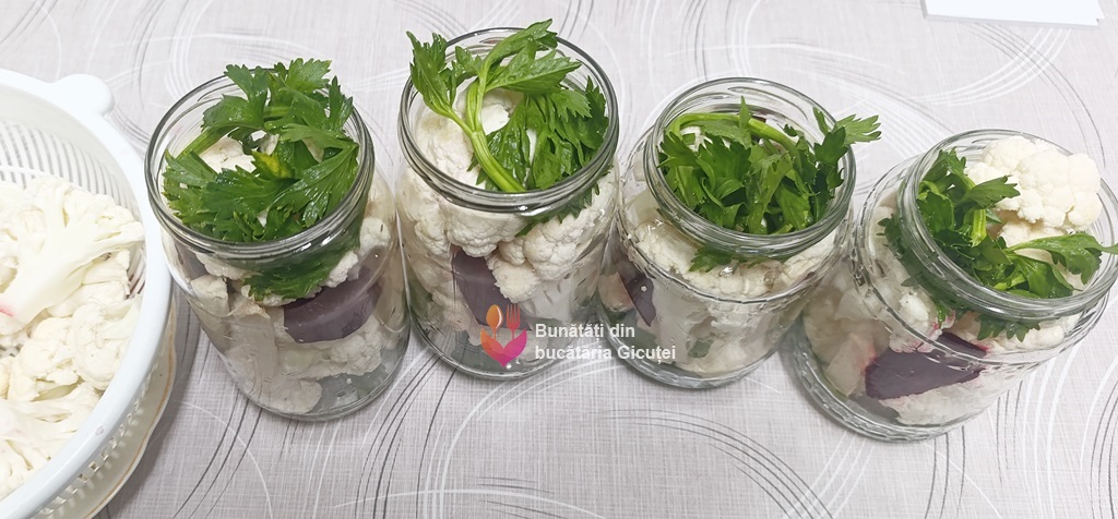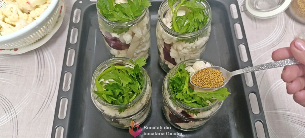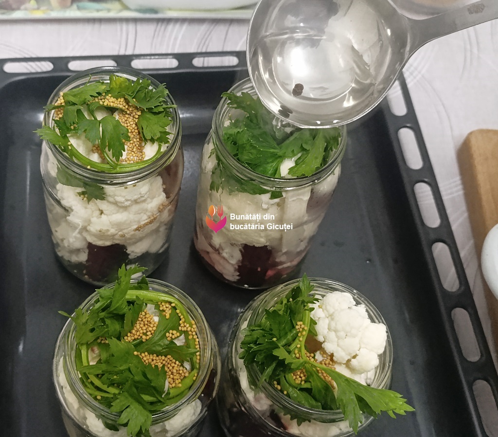 Începem să umplem borcanele: pe fundul fiecăruia punem mai întâi câte o tijă de țelină, apoi așezăm buchețele de conopidă. Printre ele, punem bețișoare de hrean și felii de sfeclă roșie. Este important să nu îndesăm conopida prea tare, ca să nu se sfarme. Dacă vă mai rămân câteva buchețele, le puteți pune a doua zi, deoarece conopida se va mai lăsa. Mie mi-a rămas Deasupra conopidei, punem din nou câte o tijă de țelină și adăugăm câte o jumătate de linguriță cu boabe de muștar la fiecare borcan.