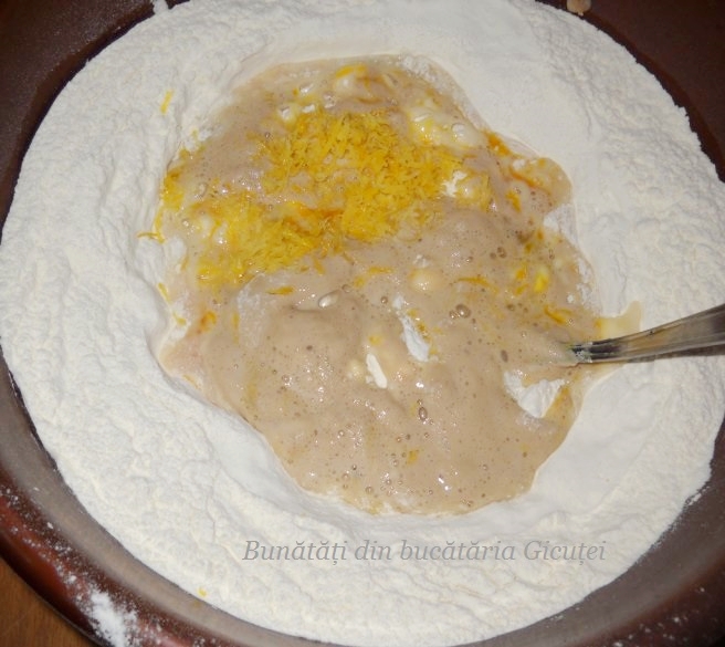Cernem faina de doua ori intr-un castron mai mare si facem o gropita in mijlocul ei. Punem drojdia dospita(in cazul meu) amestecul de oua si lapte, coaja de lamaie si jumatate din amestecul de unt si ulei.