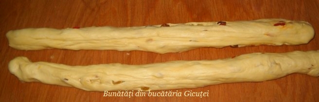 Cand aluatul a dospit suficient il rasturnam pe masa de lucru unsa cu putin ulei si il mai framantam putin(1 minut). Il impartim in doua parti egale, dam forma de rulou fiecarei bucati si le impletim prin rasucire. Il puteti pune intr-o tava normala de cozonac in care asterneti hartie de copt sau cum am facut eu, intr-o forma de guguluf unsa cu unt. Lasam cozonacul la dospit cam trei sferturi de ora, apoi il ungem cu oul batut si il punem in cuptorul preincalzit.