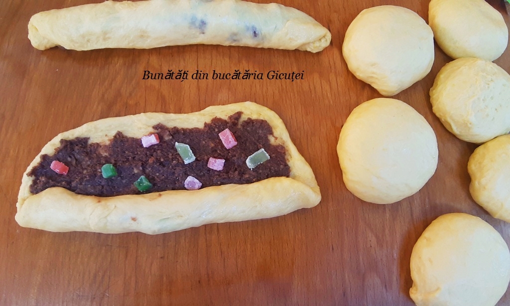 Cand aluatul este crescut il impartim in 8 bucati( sau 6 daca folositi tavi mai mari) pe care le framantam putin, doar cat sa iasa aerul din ele si sa le dam forma rotunda. Intindem fiecare bila de aluat pe blatul uns cu putin ulei intr-o foaie dreptunghiulara, groasa cam de 5-6 mm. Intindem din umplutura pe toata suprafata foii lasand marginile libere cam de un deget. Punem bucati de rahat, apoi rulam lejer pe latura mare si ciupim/sigilam cu degetele aluatul acolo unde se imbina. Impletim prin rasucire cate doua rulouri si le asezam in tavile tapetate cu hartie de copt. Acoperim tavile cu un prosop curat(avem grija sa nu atinga aluatul) sau folie alimentara si ii lasam la crescut aproximativ trei sferturi de ora. Dupa acest timp ungem cozonacii cu galbenusul diluat cu lapte, decoram cu miez de nuca si punem tavile in cuptorul preincalzit la foc mediu( 170-180 °C) pentru aproximativ 50 de minute sau pana cozonacii se rumenesc frumos. In primele 20 de minute NU vom deschide usa cuptorului. Eu am 2 cuptoare si am copt cozonacii in acelasi timp. Daca ii coaceti pe rand, sfatul meu este sa formati mai intai 2 cozonaci si dupa ce ii puneti in cuptor ii pregatiti si pe ceilalti. Cand sunt gata, ii scoatem din tavi si ii lasam la racit in bucatarie, la loc caldut. Noi nu am avut rabdare si am rupt dintr-un cozonac cand era cald…ce aroma, ce bunatate ! Consumam cu moderatie, da