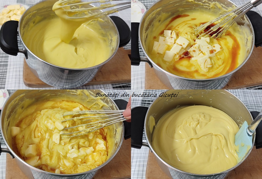 Intr-o cratita cu peretii mai grosi amestecam cu telul in forma de para, galbenusurile cu zaharul si sarea. Punem si faina, amestecam din nou, apoi turnam treptat laptele rece. Amestecam bine ca sa nu fie cocoloase, apoi punem cratita pe foc. Fierbem crema pe foc foarte mic amestecand continuu ca sa nu se lipeasca de fundul si peretii vasului. Cand devine ca o smantana mai groasa(dupa aproximativ 5-7 minute de fierbere) oprim focul de sub cratita. Lasam crema sa se racoreasca putin, apoi punem cubuletele de unt si aromatizam cu vanilie. Amestecam bine pana la omogenizare, acoperim suprafata cremei cu folie alimentara si o lasam sa se raceasca.