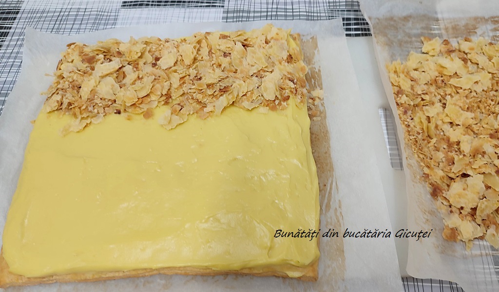 Asezam prima foaie pe o tava/platou sau chiar in tava in care am copt-o. Eu am pus-o cu hartie cu tot pe un tocator mai mare. Intindem toata crema uniform. Cea de a doua foaie o rupem si o faramitam in bucati mici. Presaram firimiturile pe toata suprafata cremei, apoi cernem deasupra zahar pudra. Lasam prajitura sa stea macar 3-4 ore in frigider, apoi o portionam si o putem servi. Un deliciu!