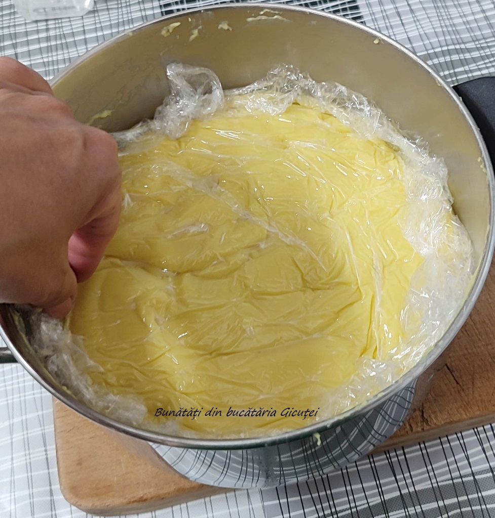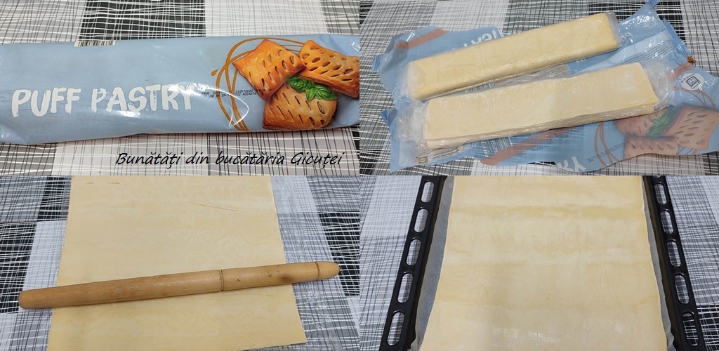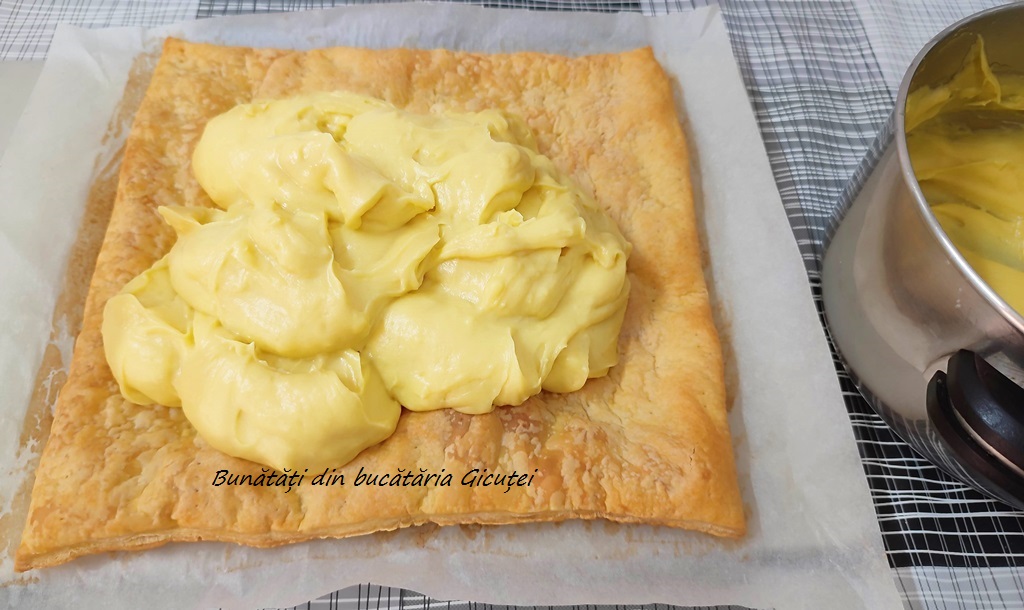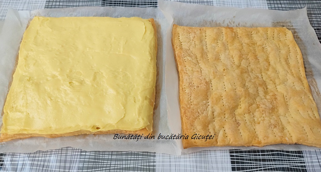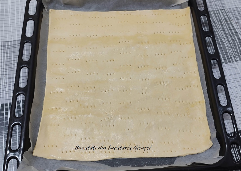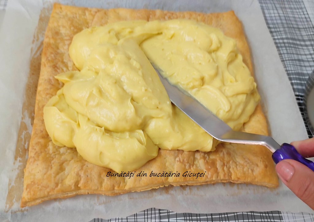Cat timp se raceste crema coacem bucatile de aluat. Aluatul trebuie sa il lasam cateva ore bune in frigider ca sa se decongeleze, preferabil peste noapte. Daca va grabiti il puteti lasa si in bucatarie la dezghetat, dar sa nu fie foarte cald.