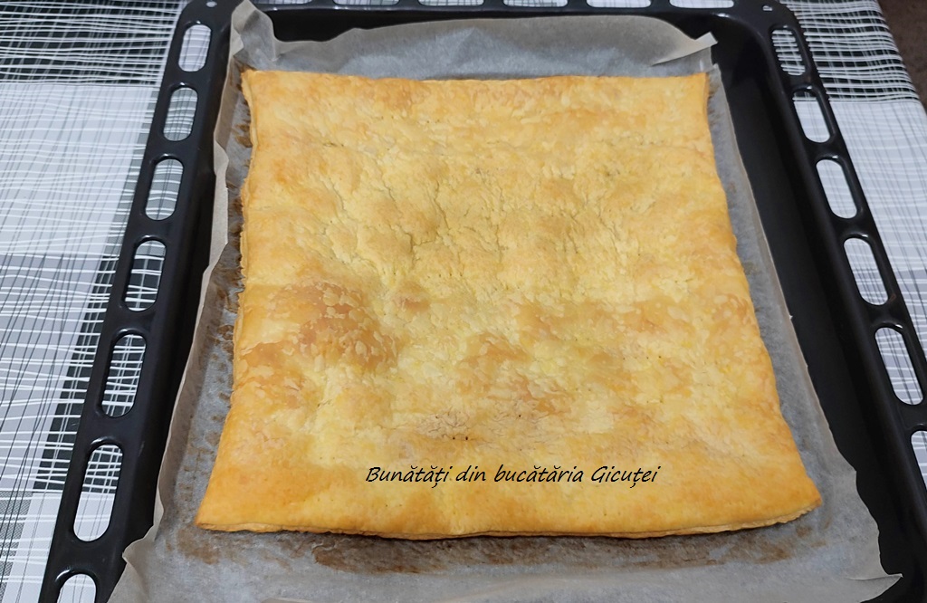 Cuptorul trebuie sa fie incins la foc iute( 200 °C). Luam prima bucata de aluat, o desfacem cu atentie din folie si o intindem cu sucitorul foarte putin doar cat sa o indreptam. O asezam in tava captusita cu hartie de copt. O intepam din loc in loc cu furculita, apoi introducem tava in cuptor pentru aproximativ 25 de minute sau pana se rumeneste frumos. Cand este gata, o scoatem din tava cu hartie cu tot si o lasam sa se raceasca. La fel procedam si cu a doua bucata de aluat.