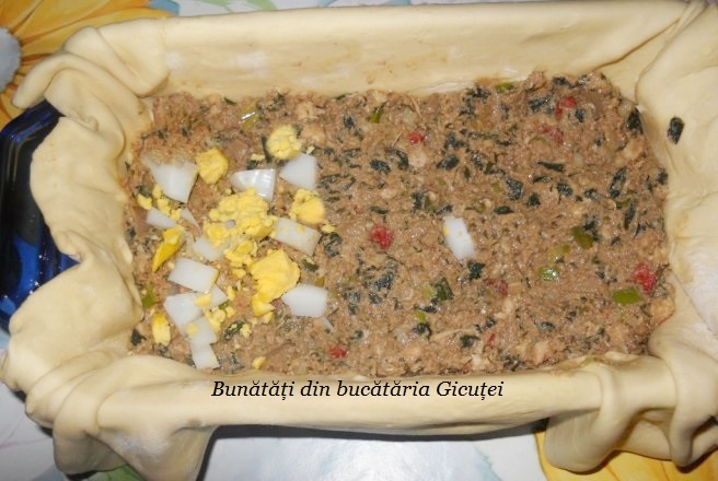 Lasam foaia de aluat mai mare ca sa cada peste marginile tavii. Asezam jumatate din compozitia de drob, punem ouale fierte si taiate cubulete, apoi acoperim cu restul de compozitie. Taiem marginile aluatului in fasii de cca. 1 cm latime, apoi le unim una peste cealalta deasupra compozitiei. Ungem deasupra aluatul cu galbenus de ou si dam tava la cuptorul preincalzit la foc mediu( 180°C ) pentru aproximativ o ora sau pana aluatul se rumeneste frumos. Cand este gata, scoatem tava cu drobul din cuptor si il lasam la racit. Feliem drobul dupa ce se raceste complet. Bunatate!