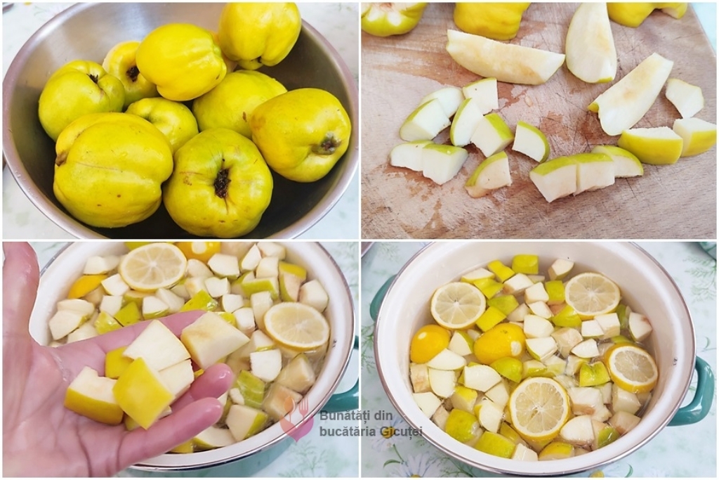 Spalam foarte bine gutuile indepartand puful, apoi le lasam la scurs. Punem intr-un vas cca 1,5 l apa rece impreuna cu o lamaie feliata…stoarcem feliile de lamaie in vasul cu apa, apoi le punem si pe ele acolo. Taiem fiecare gutuie in jumatate, scoatem cotorul, apoi fiecare jumatate o taiem in felii potrivite ca marime. Indepartam partea lemnoasa dupa fiecare felie de fruct. Taiem feliile in cubulete mai maricele si le punem direct in vasul cu apa si lamaie. In felul acesta gutuile oxideaza mai putin. Este prima data cand las si coaja pe bucatile de gutui, dulceata a iesit mult mai aromata.