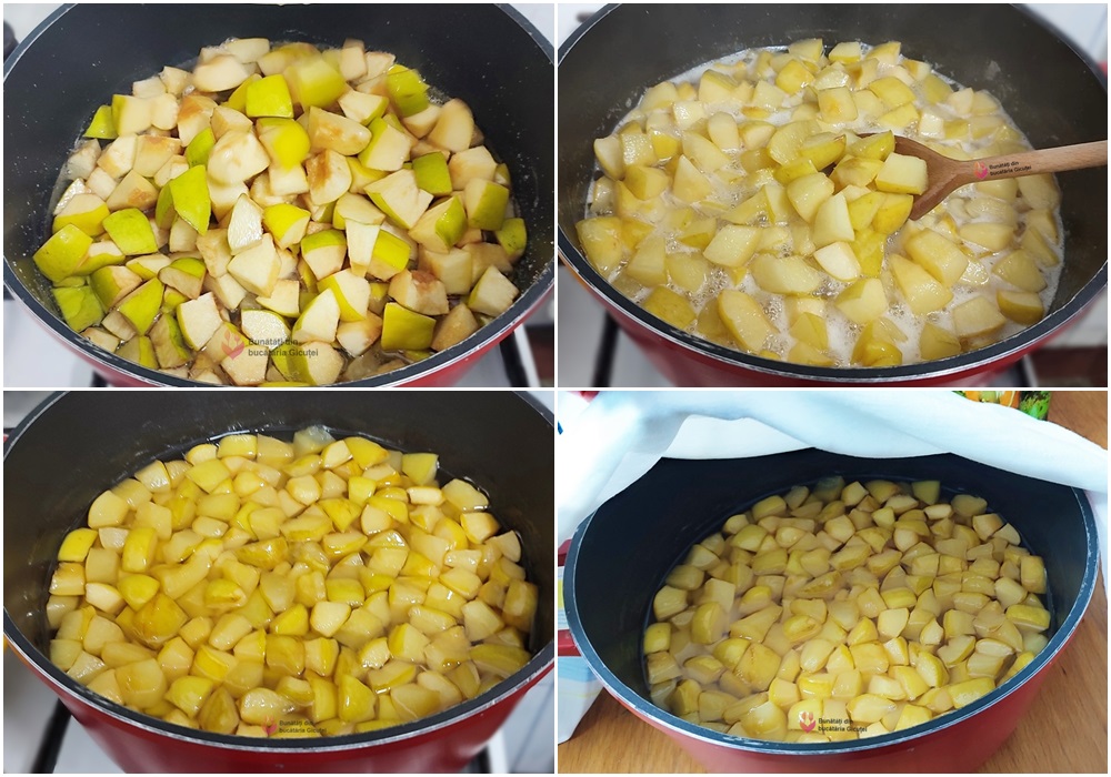 Punem zaharul si apa intr-o cratita cu fundul si peretii mai grosi, apoi o asezam pe foc mediu. Amestecam pana se dizolva tot zaharul avand grija sa nu il caramelizam…deci pana este gata stam langa cratita si amestecam . Cand siropul incepe sa fiarba( nu trebuie sa se ingroase), sa fac mici bule, punem gutuile taiate pe care le vom scoate inainte din apa si le vom lasa la scurs intr-o strecuratoare. Adaugam si sucul de la o lamaie, amestecam in cratita, reducem focul la mic si lasam gutuile sa fiarba un sfert de ora dupa primul clocot. Dupa acest timp luat cratita de pe foc, o acoperim cu un prosop de bucatarie (nu capac) si lasam gutuile sa isi mai traga din sirop cel putin 12 ore. Eu am facut aceasta operatiune seara si am continuat a doua zi pe la pranz. A doua zi spalam si clatim bine borcanele (6-7 borcane de 370 ml) si capacele acestoara, apoi le sterilizam 15-20 de minute in cuptor. Procedeul de sterilizare a borcanelor il gasiti aici.