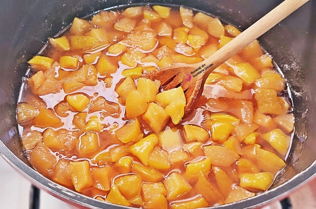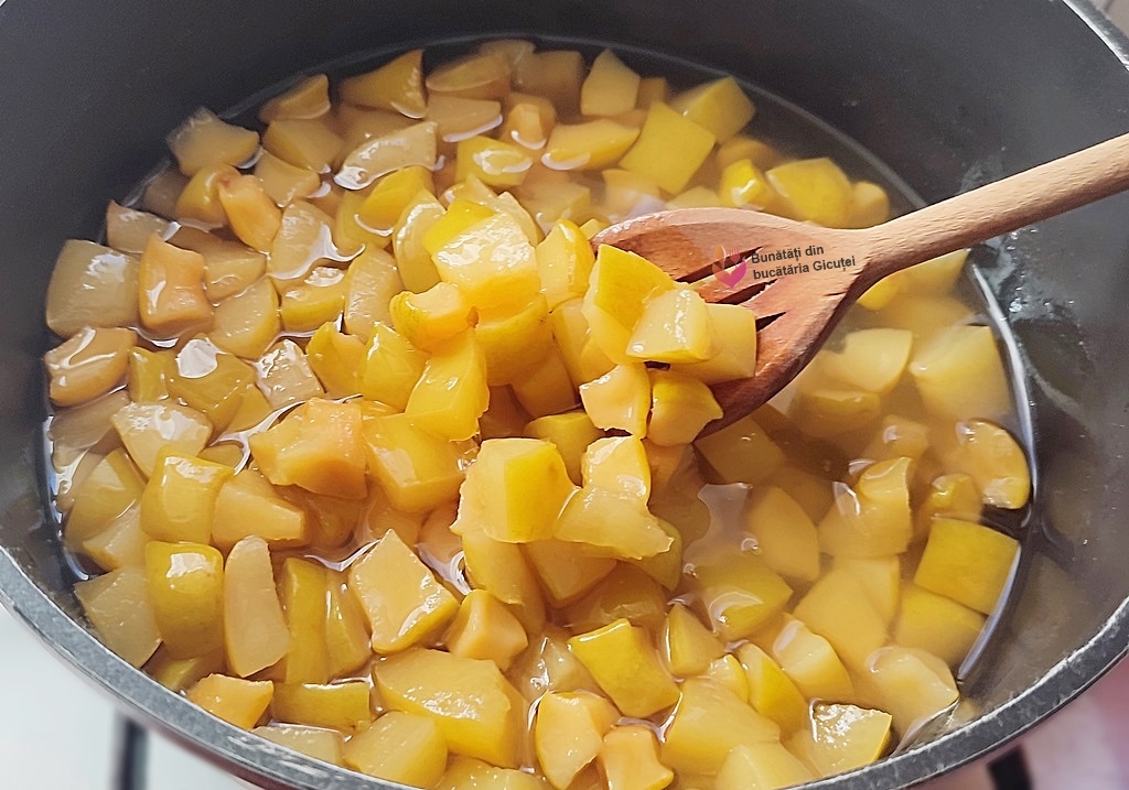 La aceasta reteta de dulceata am folosit gutuile cu coaja cu tot si a iesit foarte buna si aromata. Am taiat gutuile in cuburi mai maricele care aproape ca s-au confiat in sirop. Este o dulceata cu o textura foarte placuta si parfum de toamna.