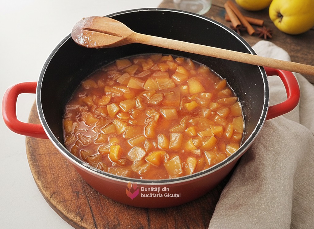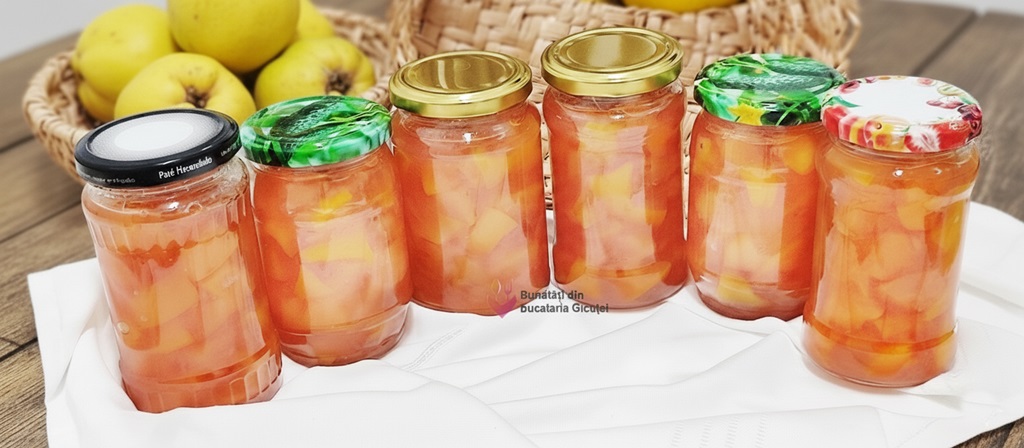 Acum putem continua prepararea dulcetii: asezam cratita cu gutuile pe foc mediu spre iute si cand dulceata incepe sa fiarba reducem focul. O mai lasam la fiert cam o jumatate de ora sau pana dulceata mai scade si fructele sunt bine patrunse. Timpul de fierbe depinde mult si de vasul in care facem dulceata, dar si de cantitatea pe care o facem. Daca facem dulceata intr-un vas mai larg apa se evapora mai repede si se reduce timpul de fierbere. Daca facem cantitate mai mare de dulceata timpul de fierbere va fi mai mare. Cat timp fierbe dulceata avem grija sa inlaturam spuma care se formeaza si sa stergem din cand in cand marginile interioare ale cratitei cu un burete nou de bucatarie sau o panza curata imbibata in apa si stoarsa bine. Amestecam cu grija ca sa nu tercium prea mult cuburile de fructe. Dulceata nu trebuie fiarta in exces, trebuie sa fie mai lichida ca se mai ingroasa cand se raceste…cand incepe sa isi schimbe culoarea, sa devina mai rosiatica sau portocalie putem sa face proba picaturii: trecem cu lingurita prin dulceata si lasam sa cada ultimile picaturi pe o farfurie curata si perfect uscata. Daca picaturile nu se imprastie, dulceata este gata. Culoarea dulcetii depinde foarte mult de soiul de gutui si de cat timp o fierbem. Oricum dulceata se va mai inchide la culoare in timp ce este pastrata in borcane….pana la urma gustul conteaza, nu? Cand este gata, lasam dulceata sa se racoreasca putin, apoi o punem in borcanele sterilizate si le infiletam cu capacele. Ca sa fiti siguri ca dulceata va tine fara probleme chiar si in camara, recomand sa sterilizati in cuptor si borcanele umplute. Le puneti in tava cuptorului, porniti cuptorul la foc mic( nu incingeti cuptorul inainte, da? ) apoi dupa 15-20 de minute opriti cuptorul si lasati acolo borcanele pana se racesc complet. Cand borcanele se racesc complet le etichetam si le punem pe raftul din camara….nu inaite de a o gusta