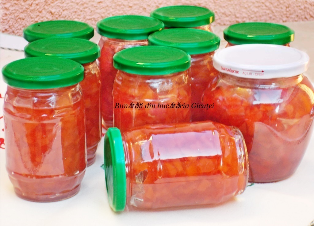 Când dulceața este gata, o punem fierbinte în borcanele pregătite dinainte. Pe măsură ce le umplem, le sigilăm cu capace și le întoarcem cu fundul în sus ca să facă vid. După un sfert de oră, le ridicăm în poziția normală și le acoperim cu un prosop gros. Le lăsăm să se răcească complet, apoi le depozităm pe raftul din cămară/pivniță. Din cantitățile menționate, mi-au ieșit 9 borcănele de 370 g și un borcan de 450 g. Deliciu de toamnă!