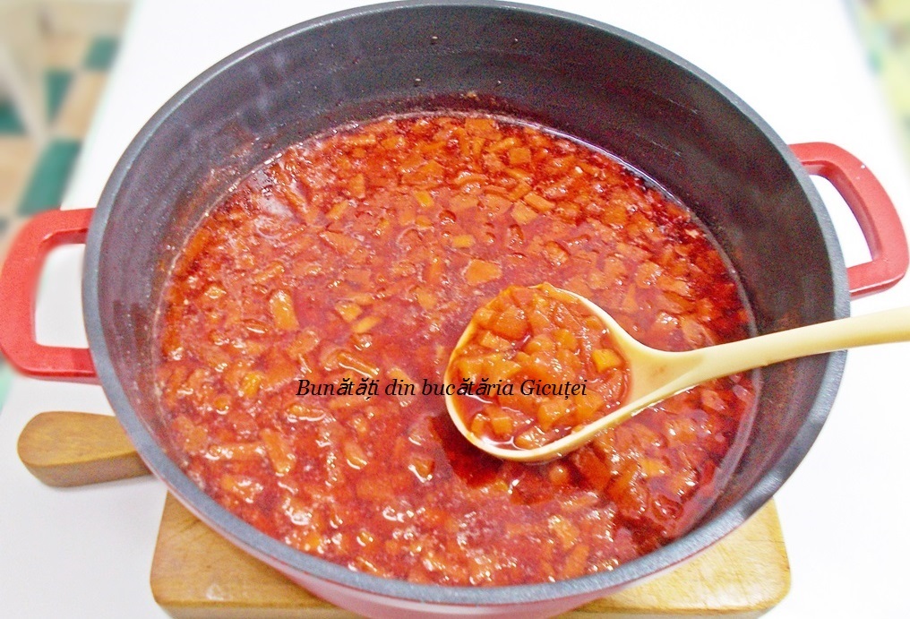 Update: În mod obișnuit, când facem dulcețuri, trebuie să ștergem tot timpul marginile interioare ale cratiței cu un burete nou, îmbibat în apă și stors bine, și să înlăturăm spuma care se formează deasupra…. De data asta nu am făcut-o, iar cu toate acestea dulceața mea a ieșit grozav de bună și nu s-a zaharisit. Am mai avut un borcănel rămas cu dulceață făcută acum trei ani, ce-i drept dulceața s-a mai închis la culoare, dar aroma și gustul au rămas la fel. Spor la făcut bunătăți!