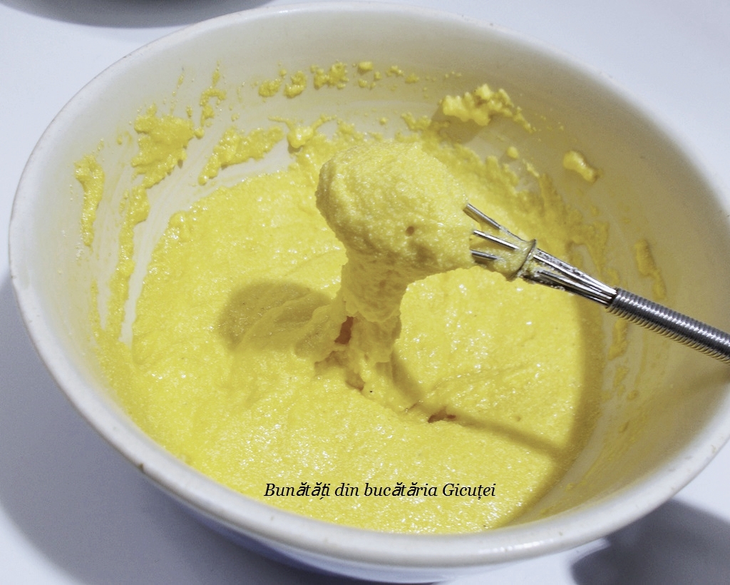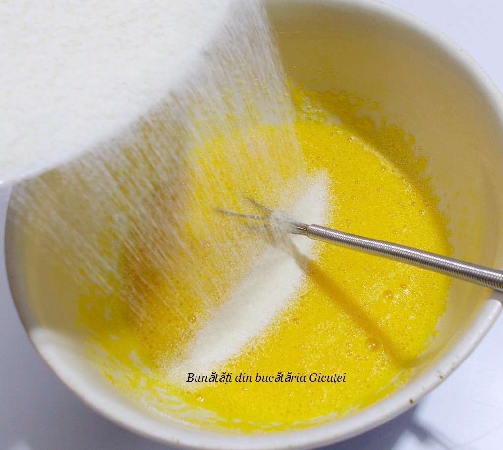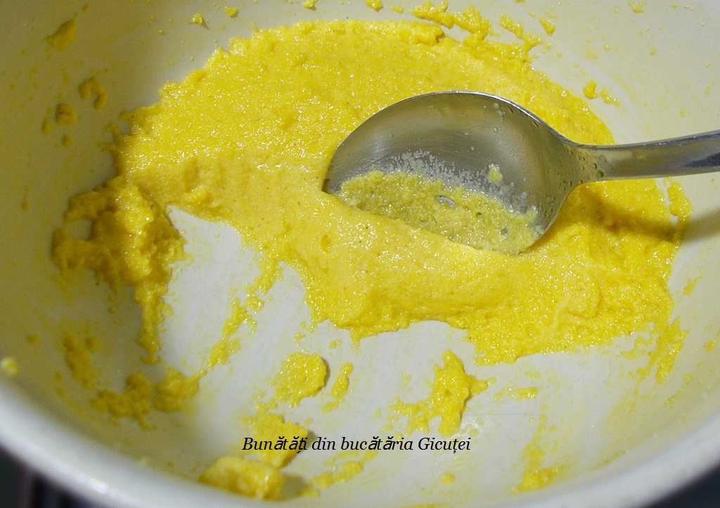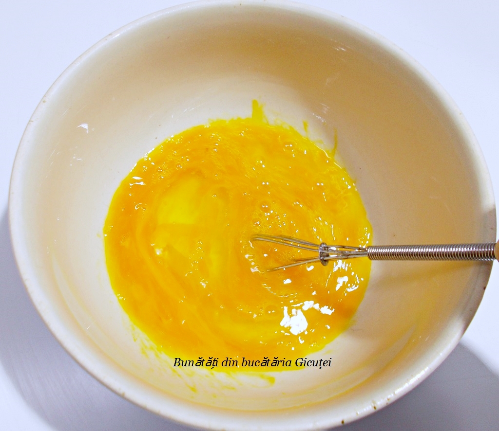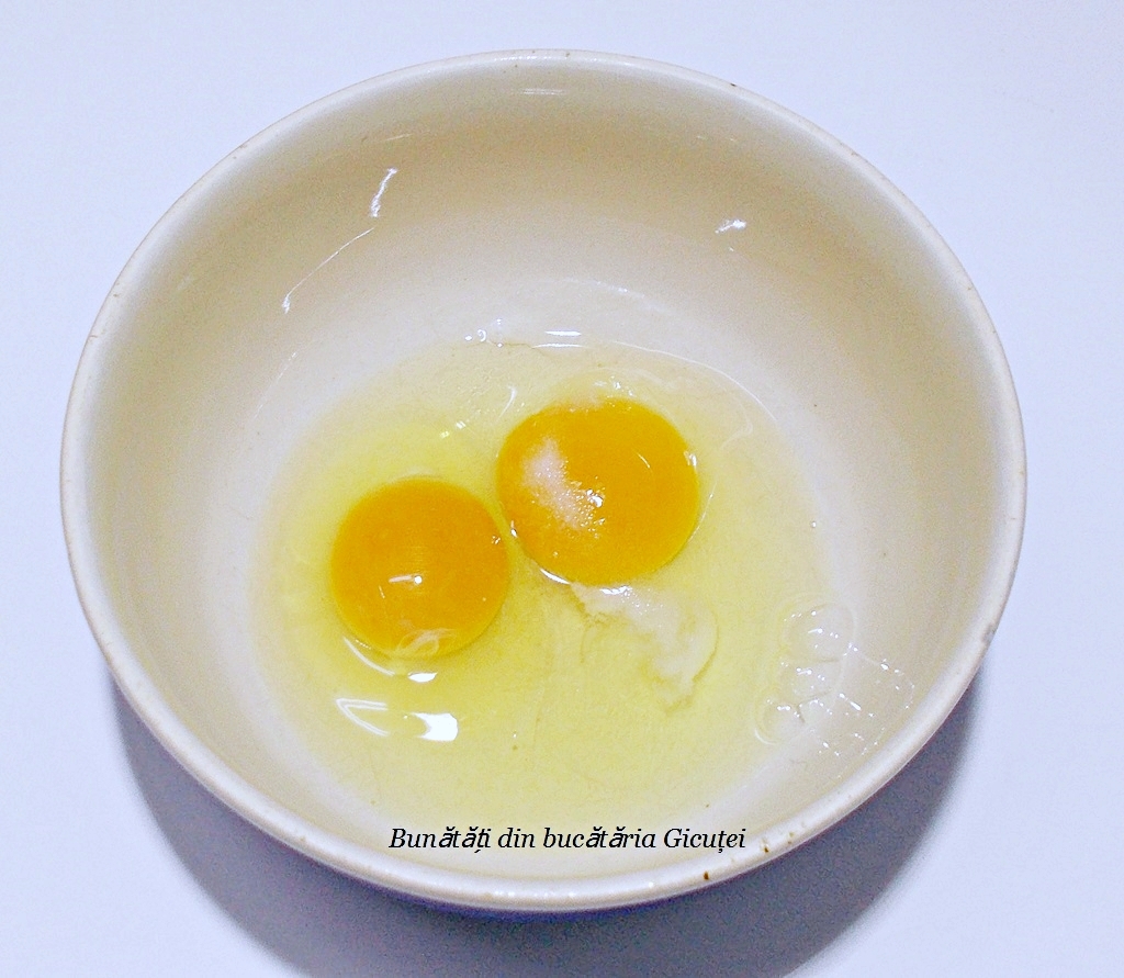 Spargem ouale intr-un castron si presaram putina sare peste ele. Le batem bine cu furculita sau cu un tel in forma de para, apoi adaugam in ploaie si in mai multe reprize grisul. Amestecam bine de fiecare data. Lasam compozitia deoparte 10- 15 minute ca sa se umfle grisul. Grisul pe care il vom folosi nu trebuie sa fie fin, trebuie sa aiba o granulatie mai mare ca altfel galustile ies tari. Cand cumparam gris ne uitam pe pachet ca nu cumva sa fie scris gris extrafin. La aceasta reteta am folosit gris marca Baneasa.