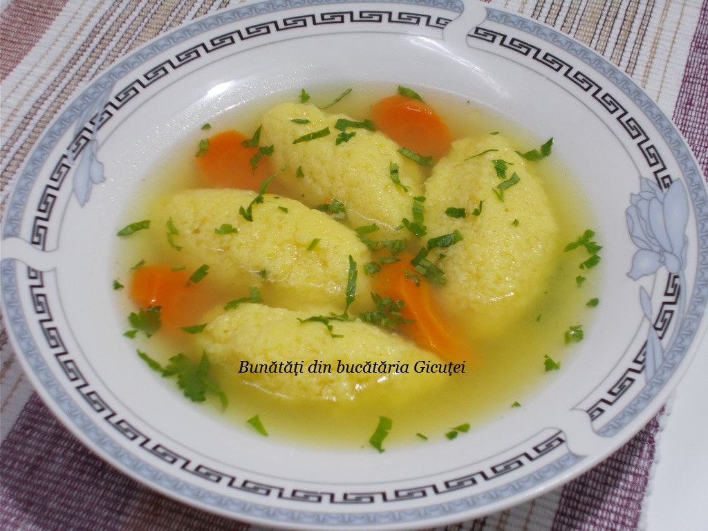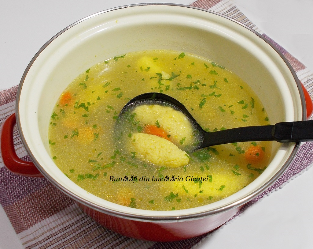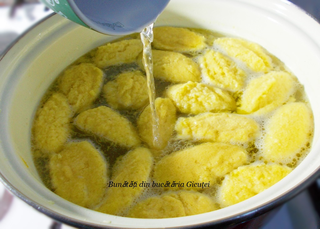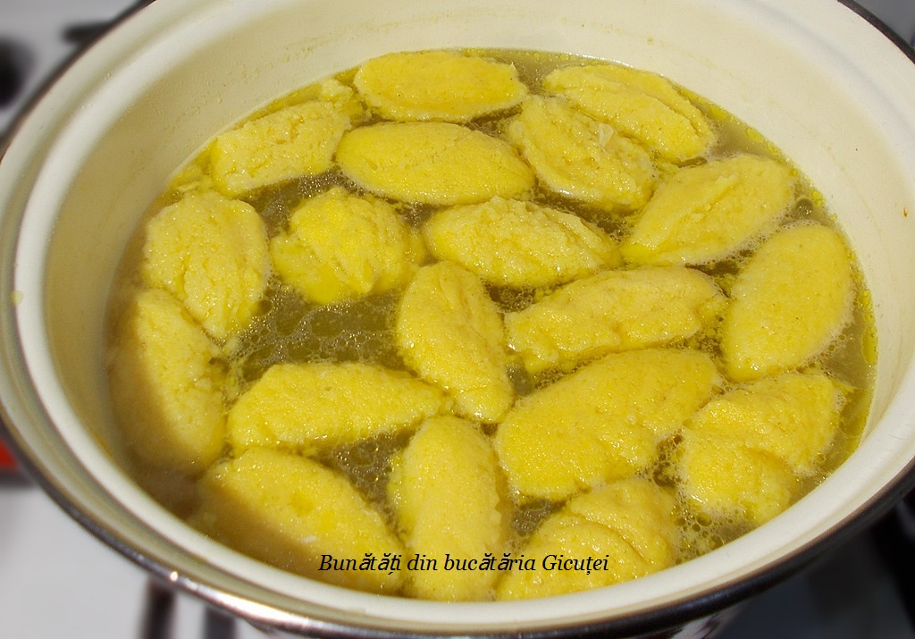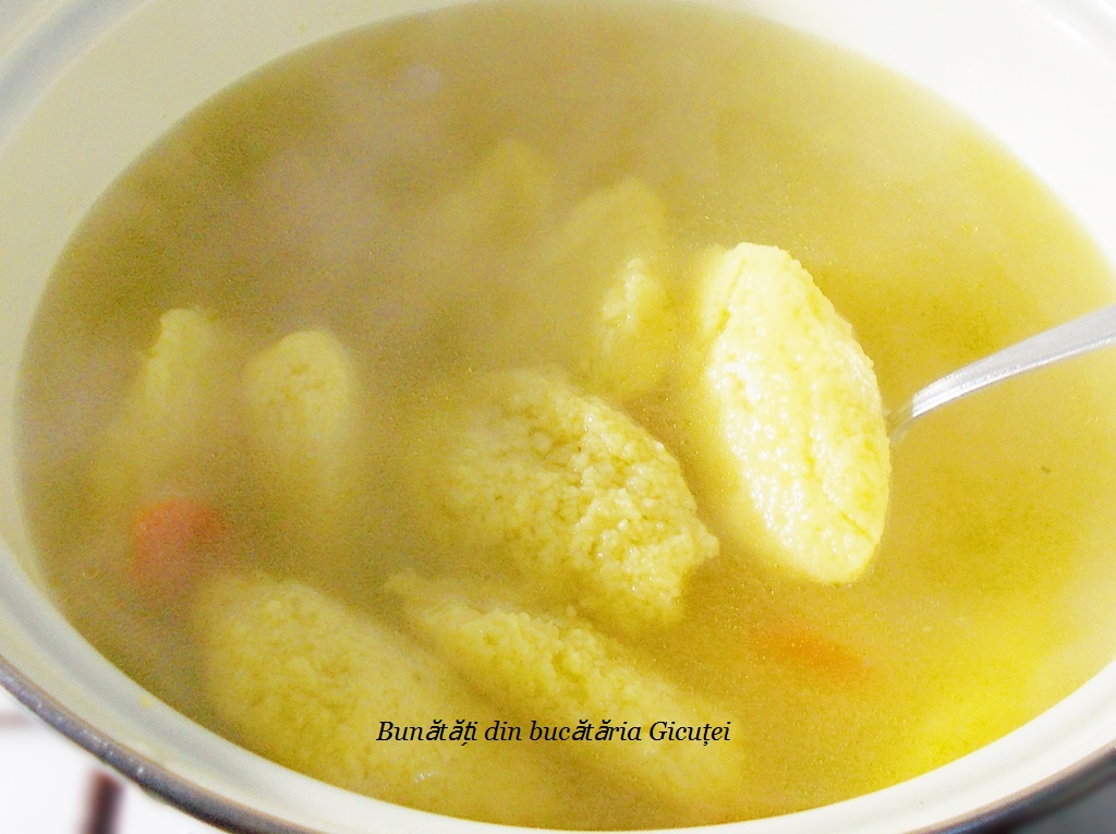 Dupa acest timp “taiem” cu lingura din compozitia de galuste si punem in supa fierbinte (nu trebuie sa clocoteasca). Trecem cu lingura prin supa de fiecare data cand formam o galusca.