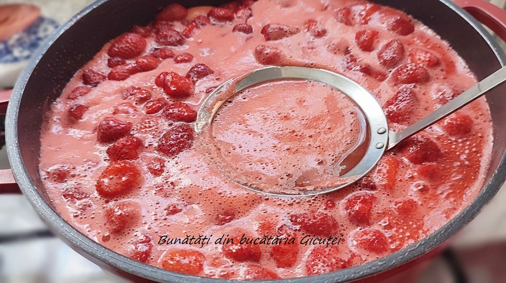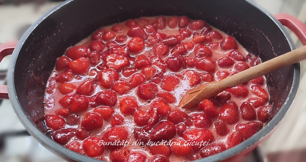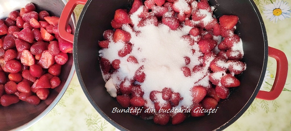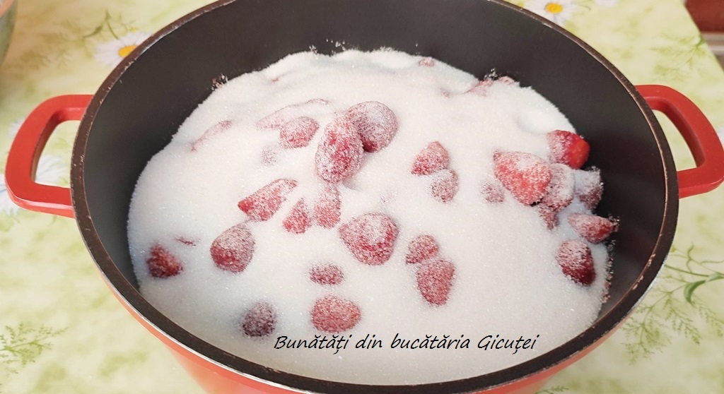Spalam capsunile sub jet de apa rece si le punem la scurs intr-o strecuratoare. Cand sunt bine scurse le indepartam coditele si curatam orice urma de stricaciune. Pe cele mai mari le taiem in jumatati, apoi le punem intr-un vas in straturi alternative cu zaharul. De preferat este sa folosim un vas mai larg si cu fundul dublu. Trebuie sa fie loc suficient in vas pentru ca gemul, la fierbere, va forma o spuma la suprafata care se va umfla, iar daca vom umple vasul cu fructe si zahar, gemul va da pe dinafara. Daca doriti puteti reduce cantitatea de zahar, dar va sfatuiesc sa NU puneti mai putin de 350 g la kg de fructe cantarite fara codite. La orice gem se pun intre 350 si 700 g zahar la kg. de fructe curatate. Depinde cat de dulci sunt fructele, depinde de gustul fiecaruia…eu am pus 600 g/ la kg. de capsuni si gemul nu a iesit foarte dulce…. zaharul nu mai indulceste ca altadata. Sa nu uitam ca zaharul este un conservant natural, cu cat punem mai putin cu atat creste riscul fermentarii/deteriorarii preparatului. Tot acum adaugam si zeama de lamaie. Zeama de lamaie pastreaza culoarea vie a fructelor si impiedica oxidarea lor. Alta data am inlocuit zeama de lamaie cu sare de lamaie, cam o lingurita cu varf la 2 kg de fructe. Acoperim vasul cu capac si il lasam la temperatura bucatariei cel putin 4 ore sau il putem tine peste noape in frigider. In acest timp zaharul se mai dizolva si se formeaza un sirop. Inainte de a pune gemul la foc pregatim borcanele si capacele acestora. Le spalam bine cu apa calda si detergent de vase, apoi le vom usca in cuptor la foc mic(120-140 °C) pentru 15-20 de minute: mai multe detalii despre sterilizarea borcanelor gasiti aici . Nu sariti peste acest pas, sterilizarea borcanelor are un rol foarte important in pastrarea perfecta a gemului. Mie mi-au iesit 6 borcanele cu gem cu capacitatea de 330 ml. fiecare. Punem vasul cu fructele pe foc iute. Amestecam usor insistand pe fundul vasului unde a mai ramas zahar nedizolvat. Cand gemul incepe sa fiarba reducem focul, iar cand incepe sa se formeze spuma o inlaturam cu o spumiera. Eu am lasat gemul sa fiarba la foc mediu aproximativ 35 de minute pana a trecut proba picaturii: am trecut cu lingurita prin gem si am lasat sa cada ultimile picaturi pe o farfurie curata si perfect uscata. Cand picaturile au ramas intregi, nu s-au imprastiat, am oprit focul de sub cratita cu gem. Daca aveti un termometru de cofetarie puteti urmari cu el temperatura gemului…cand atinge 105°C este gata. Daca faceti cantitate mai mare de gem timpul de fierbere este si el mai mare. Cand este gata, punem gemul fierbinte in borcane(borcanele le lasam in tava in care le-am sterilizat) si le inchidem cu capace. Rasturnam borcanele cu gura in jos pentru 5 minute, dupa care le intoarcem in pozitia normala si le acoperim cu o patura sau un prosop mai gros. Le lasam pana in ziua urmatoare sa se raceasca lent, apoi le depozitam pe raftul din camara. Se pastreaza foarte bine mai multi ani, doar ca in timp se mai inchide la culoare. Un deliciu!