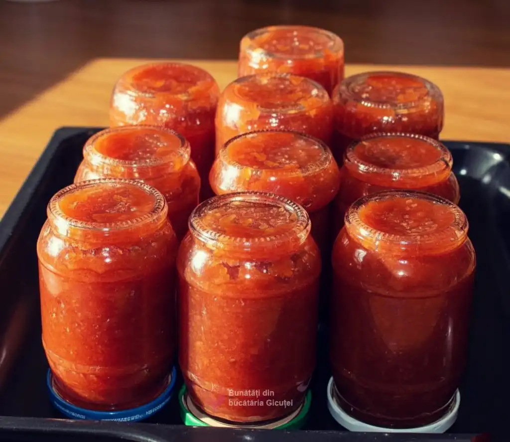 Pentru inceput ne ocupam de borcanele in care urmeaza sa punem gemul: le spalam cu apa si detergent si clatim bine, apoi le asezam intr-o tava fara sa se atinga intre ele. Punem tava cu borcanele(10-11 borcane de 370 ml) in cuptor si il aprindem la foc mic. Sterilizam borcanele in jur de 20 de minute, apoi inchidem flacara cuptorului si punem in tava cu borcane si capacele acestora spalate in prealabil. Le lasam in cuptorul cald pana se racesc si terminam gemul de facut.
