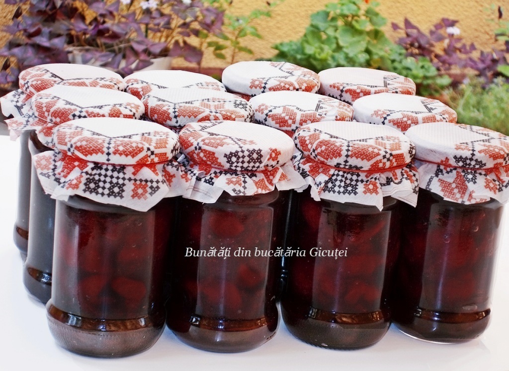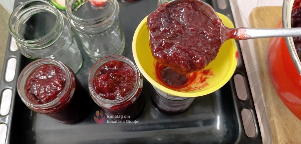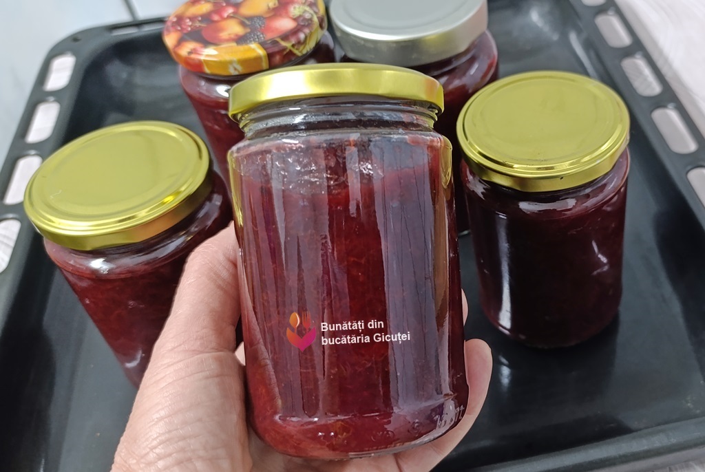 Așezăm borcanele în tava cuptorului, aprindem cuptorul la foc mic ( 100-120°C) pentru 25-30 de minute, apoi oprim cuptorul și lăsăm borcanele să se răcească complet în el.