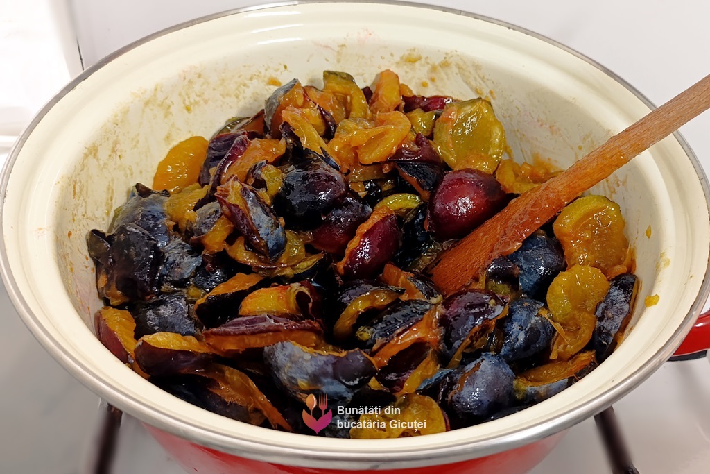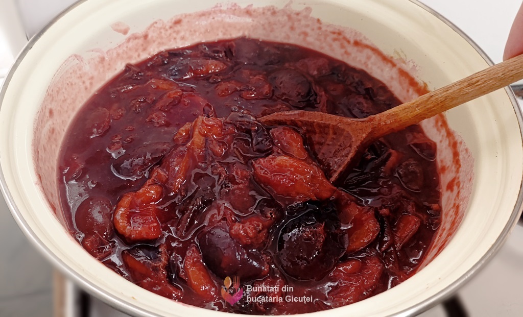 Punem cratița pe foc mic și amestecăm. După aproximativ 5-7 minute vom observa că prunele încep să lase lichid. Amestecăm constant, insistând pe fundul cratiței ca să nu se lipească.