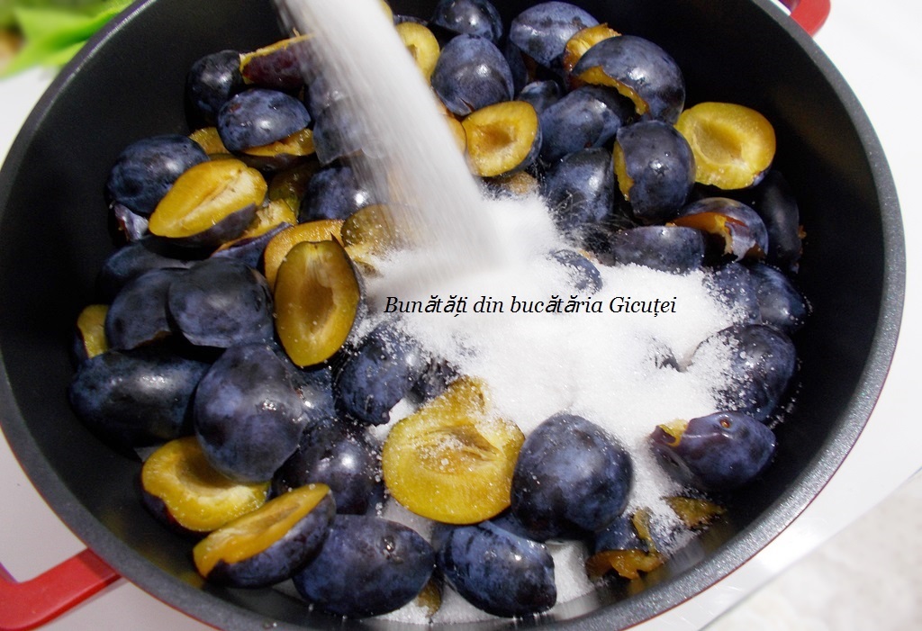Spalam prunele si le lasam la scurs in strecuratoare. Cand sunt bine scurse le rupem in doua si le scoatem samburii. Daca doriti le puteti taia in bucati mai mici. Punem prunele intr-o cratita( una care nu lipeste), in straturi alternative cu zaharul. Daca prunele sunt foarte dulci se poate pune doar 1,5 kg zahar. Adaugam si sucul de lamaie. Acoperim cratita cu capac si o lasam asa peste noapte ca prunele sa-si lase zeama.