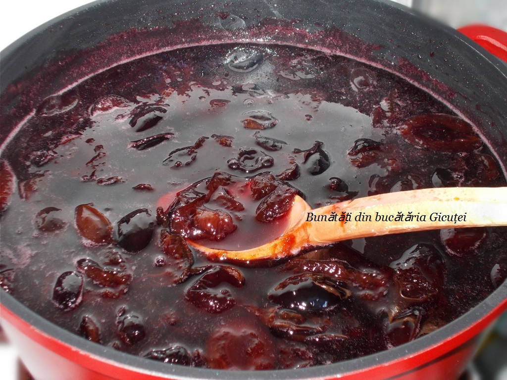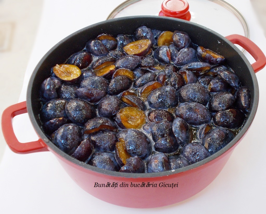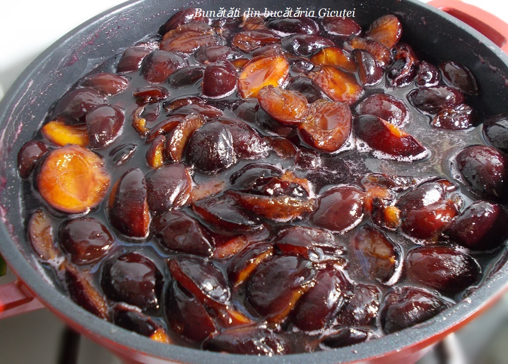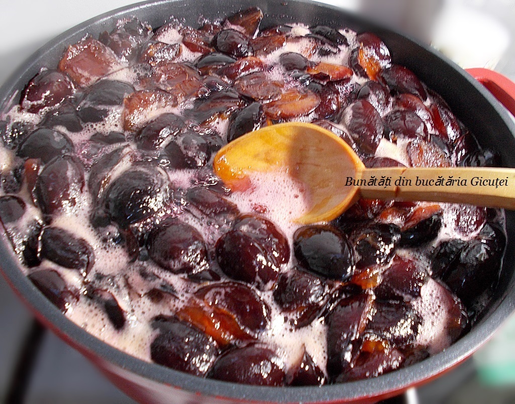 Amestecam in oala cu prune si o punem la fiert pe foc mediu. Cand incepe sa fiarba reducem putin focul. Inlaturam spuma care se formeaza deasupra prunelor, iar pe masura ce gemul se ingroasa amestecam mai des in el insistand pe fundul cratitei. Eu am fiert gemul o ora si jumatate deoarece cratita pe care am folosit-o a fost mai inalta si gemul a scazut mai greu. Timpul de fierbere poate varia in functie de cat de zemoase sunt prunele sau cat de larga este cratita in care le fierbem. Nu trebuie sa exageram cu fiertul deoarece gemul se va inchide la culoare si isi va schimba gustul. Gemul meu era destul de lichid cand l-am pus in borcane, dar a doua zi s-a inchegat si a fost perfect. Dupa gustul fiecaruia se pot adauga la sfarsit vanile, rom sau nuci. Eu l-am lasat simplu.
