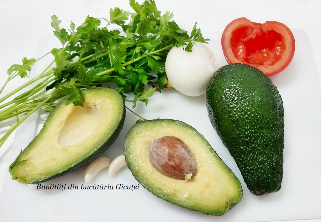 Taiem cele doua bucati de avocado in doua pe lungime si indepartam samburii. Scobim miezul cu o lingura si il punem intr-un bol. Stropim cu zeama de lamaie si pasam/zdrobim pulpa fructelor cu ajutorul unei furculite. Avocado trebuie sa isi pastreze o parte din textura, nu trebuie trasformat intr-un sos. Adaugam ceapa si rosia tocate marunt, usturoiul zdrobit sau dat pe razatoarea cu orificii mici si patrunjelul tocat. Daca doriti puteti adauga si putin ardei iute tocat fin. Condimentam cu sare si piper macinat, apoi amestecam totul. Gustam, si daca este nevoie mai adaugam sare, piper sau suc de lamaie. Servim sosul pe felii de paine prajita sau cu chipsuri din porumb/cartofi. De asemena se poate servi ca si garnitura la diverse preparare: legume, peste si carne la gratar. Este un deliciu sanatos !