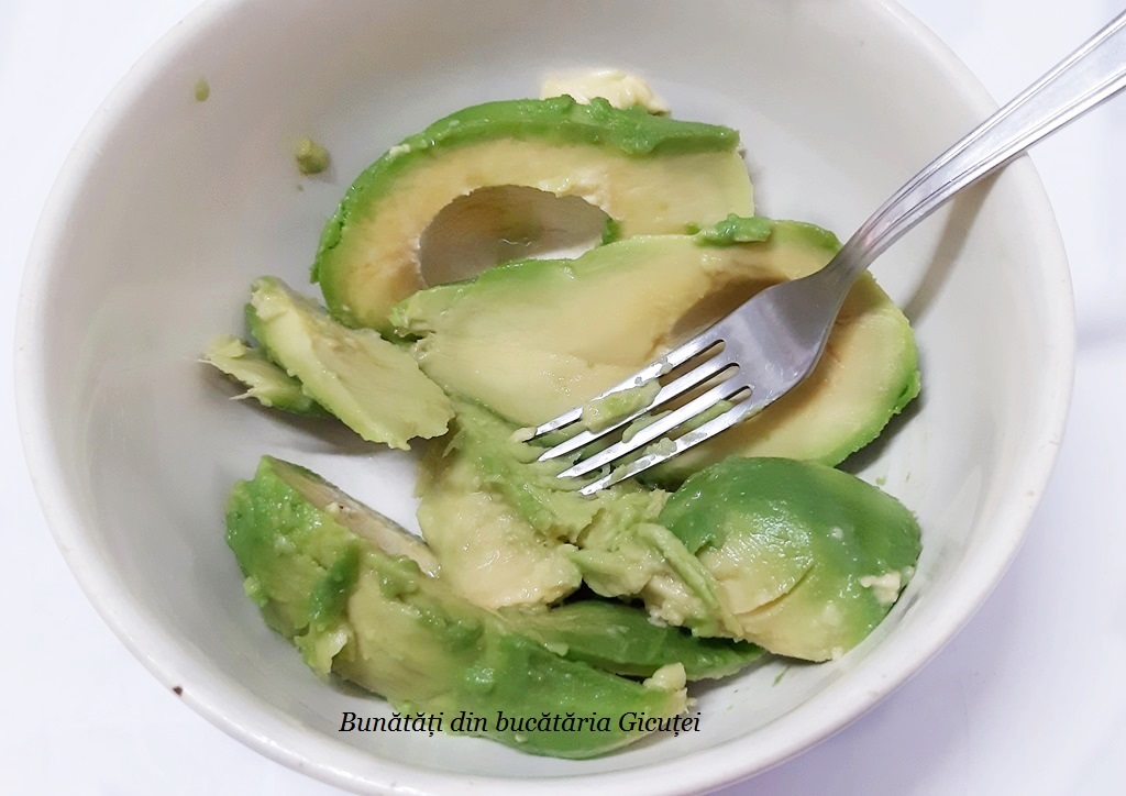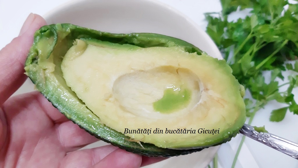 Fructele de avocado trebuie sa fie bine coapte. Nu tot timpul gasim in magazine fructe coapte(ready to eat), de obicei sunt verzi(necoapte), dar daca le lasam in fructiera alaturi de alte fructe se coc in cateva zile. Ca sa ne dam seama daca este copt, punem fructul in palma si il strangem…daca este usor moale este bun de consum. Sunt diferite soiuri de avocado, gasim in magazine fructe mai mari sau mai mici, cu forme si culori diferite. Avocado este foarte sanatos deoarece contine grasimi bune, vitamine si minerale. La aceasta reteta am folosit doua fructe avocado de marime medie cu coaja de culoare verde.