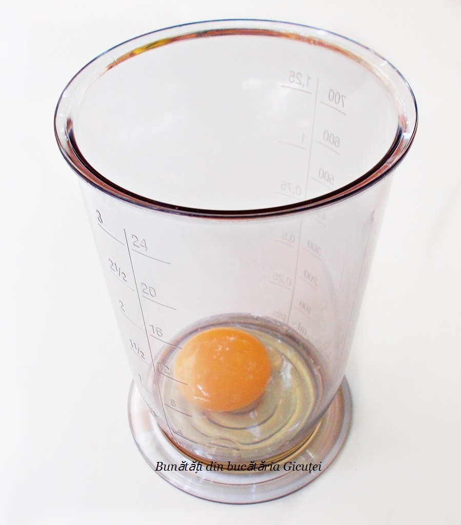 Introducem blenderul in bol astfel incat cupa lui sa cuprinda oul si sa atinga fundul vasului.